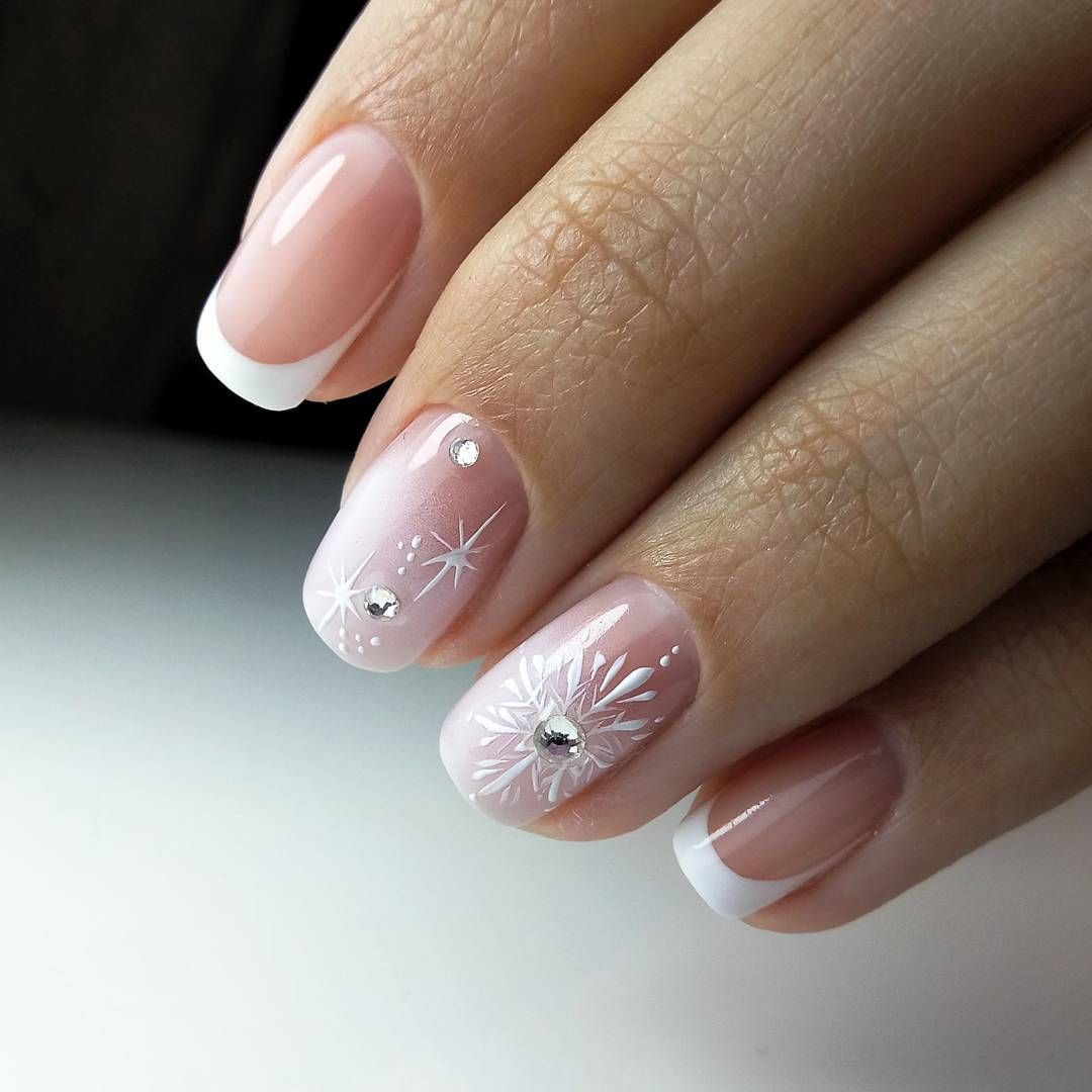 Традиционный френч станет более праздничным, если добавить тонкую линию, выложенную блестящими камушками.