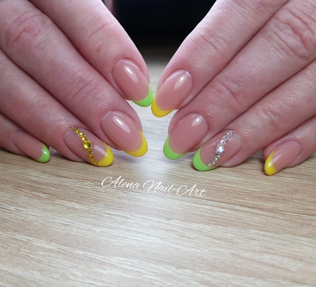 Если цель иная — привлечь максимум внимания — выбирайте неоновые оттенки. Такой французский маникюр отличная идея для жарких летний дней. Чтобы немного утихомирить интенсивность такого дизайна выбирайте в пару к неону нюдовые и прозрачные базы.