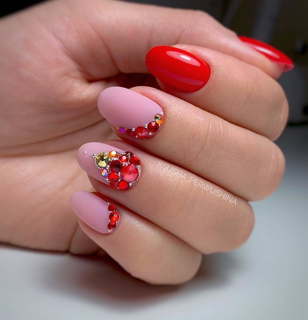 При выполнении маникюра со стразами главное помнить: если вы хотите нанести как можно больше камней, то делайте ярый акцент на одном ноготке руки, оставив другие в классической вариации; при минимализме стразы могут разместиться на всех ногтях.