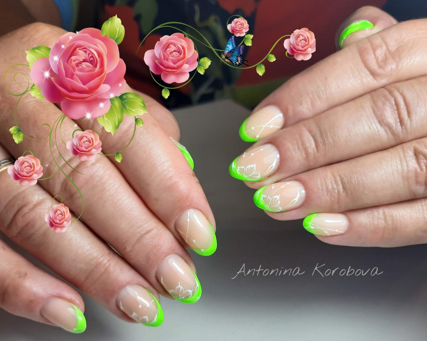 Флористический рисунок занимает лидирующее место в числе актуальных для 2020 года. Поэтому не удивительно, что его комбинируют с френчем. Разнообразные цветочки, листья, а также пальмы и даже ель можно изобразить на ногтях любой длины и формы. Главное — подобрать подходящие оттенки, чтобы такой дизайн смотрелся гармонично.