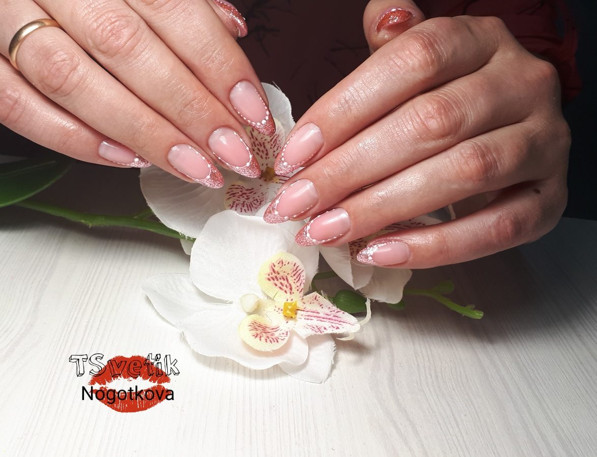 В блестящем френче допускается использование любого цвета. Чрезвычайно популярно применение розовых, серебряных и золотистых блёсток.