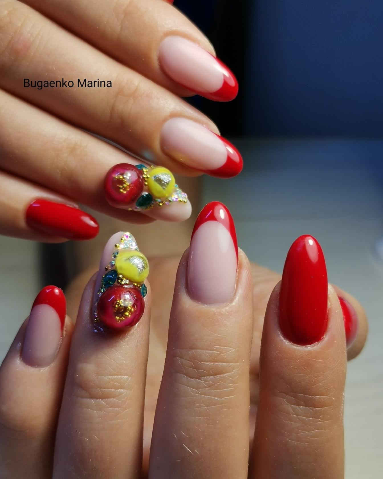Яркие краски в домашних условиях следует использовать очень осторожно, потому что французский маникюр красный с любым дополнительным цветом, кроме близкородственных (розового и бордового) будет выглядеть так, будто вы неаккуратно открывали варенье и перепачкались