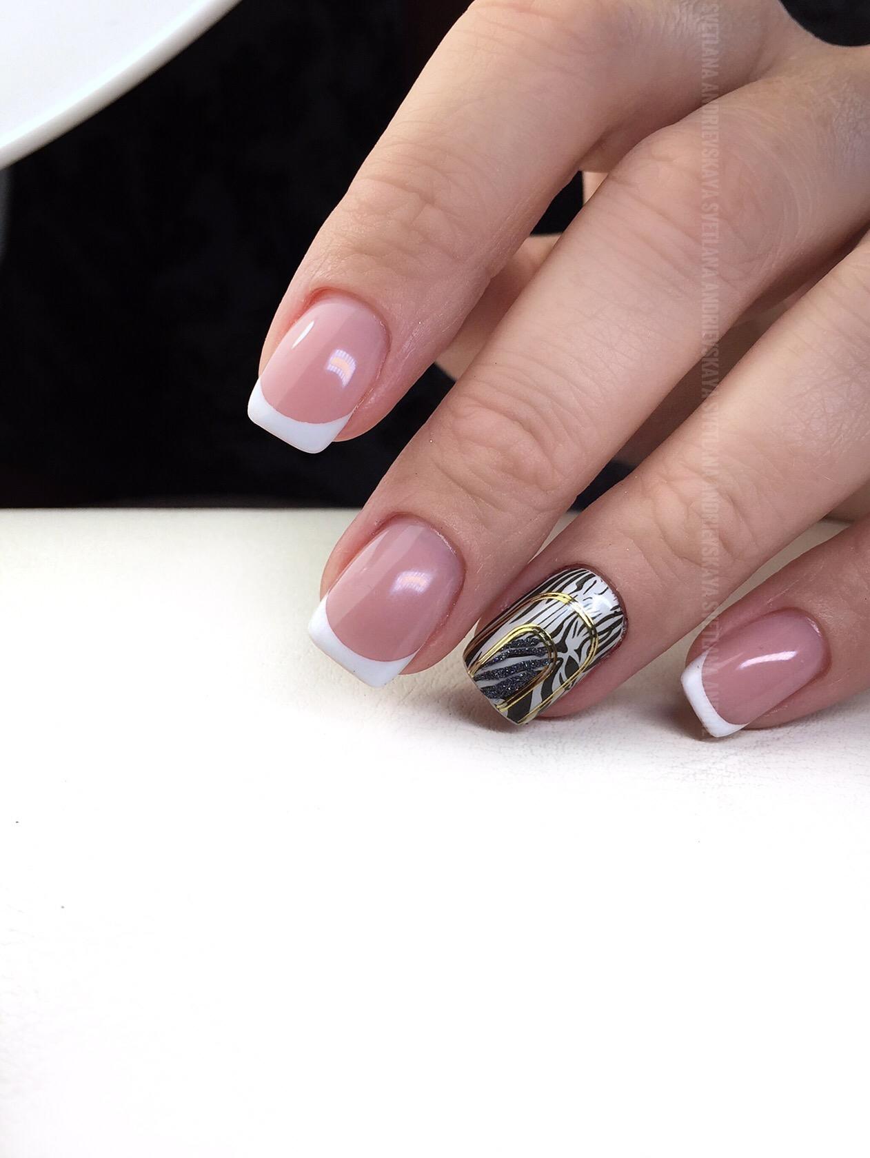 Супергорячий тренд – френч с рисунком, имитирующим животный принт. Зебра, жираф, леопард – выбирайте самостоятельно. Все эти виды френча на ногтях смотрятся сногсшибательно!