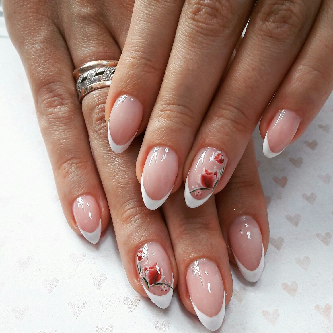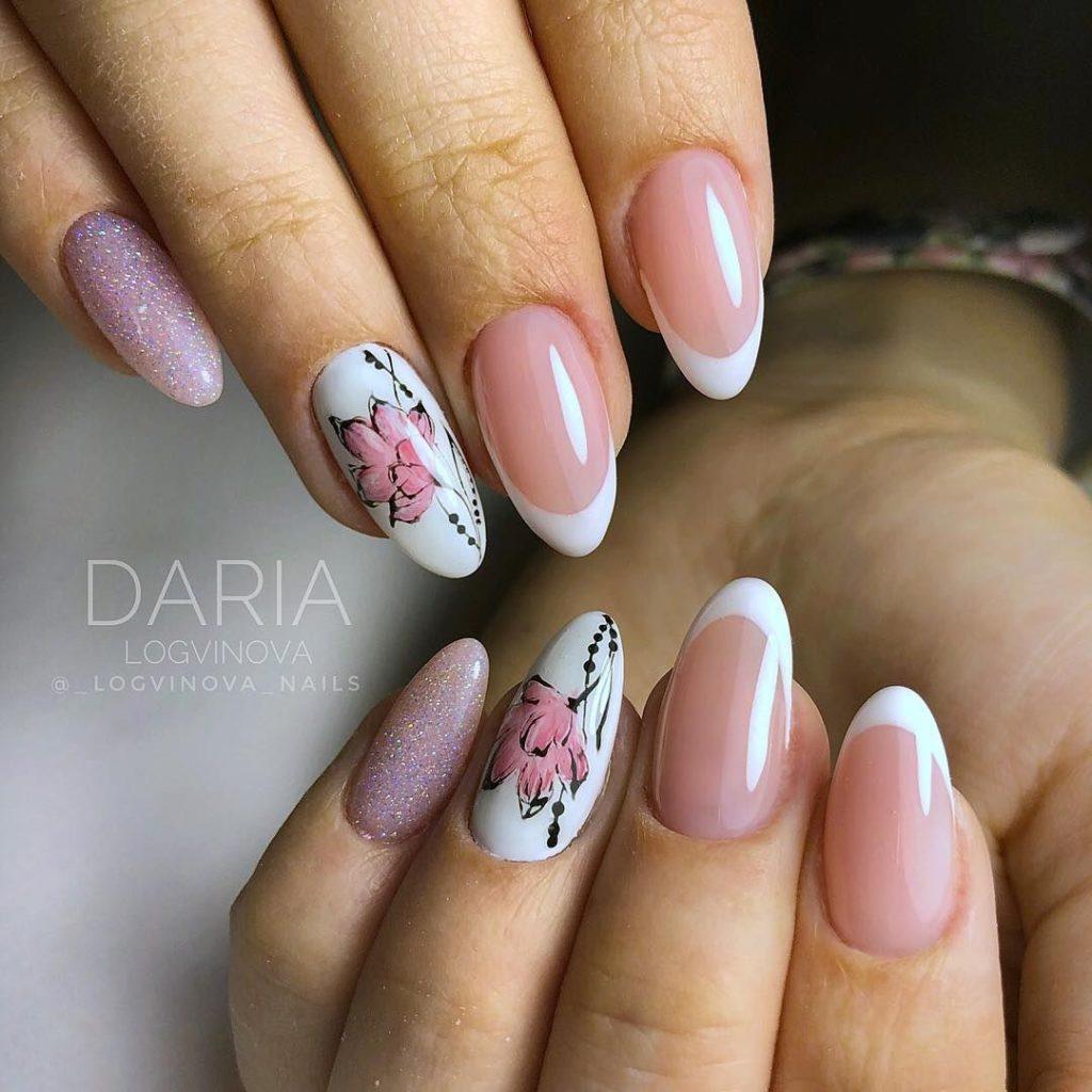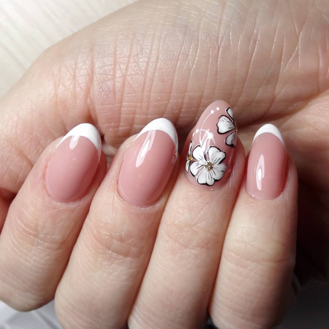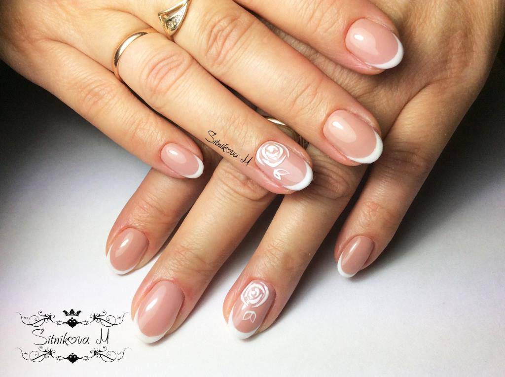 Французский маникюр шеллаком с цветочным принтом