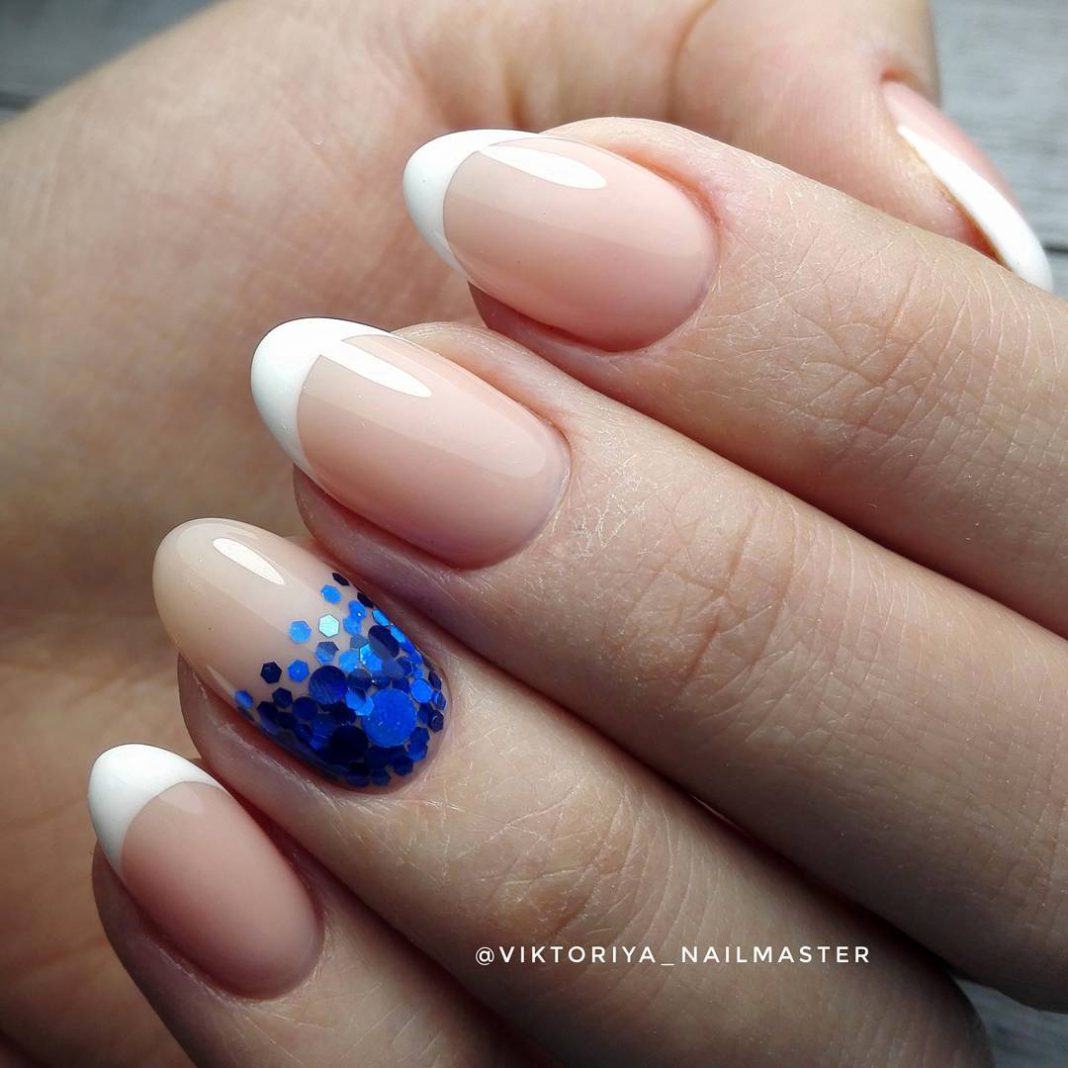 Самый простой способ разнообразить цветной френч – это добавить на несколько пальцев тонкие линии черным или белым цветом. Лучшим дополнением такого дизайна станут блестки или гель-лак с глиттером. С помощью них выделите отдельные части рисунка или край ногтевой пластины.