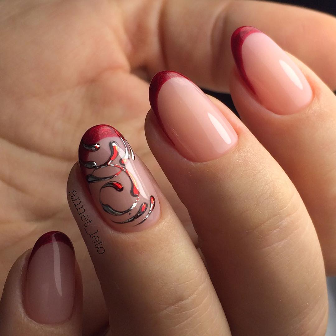 Красный френч с серебром – альтернативный вариант предыдущего дизайна. Пожалуй, это самый сдержанный вариант с красным френчем. Серебро не столь кричаще, как золото, но при этом придает благородный блеск маникюру.