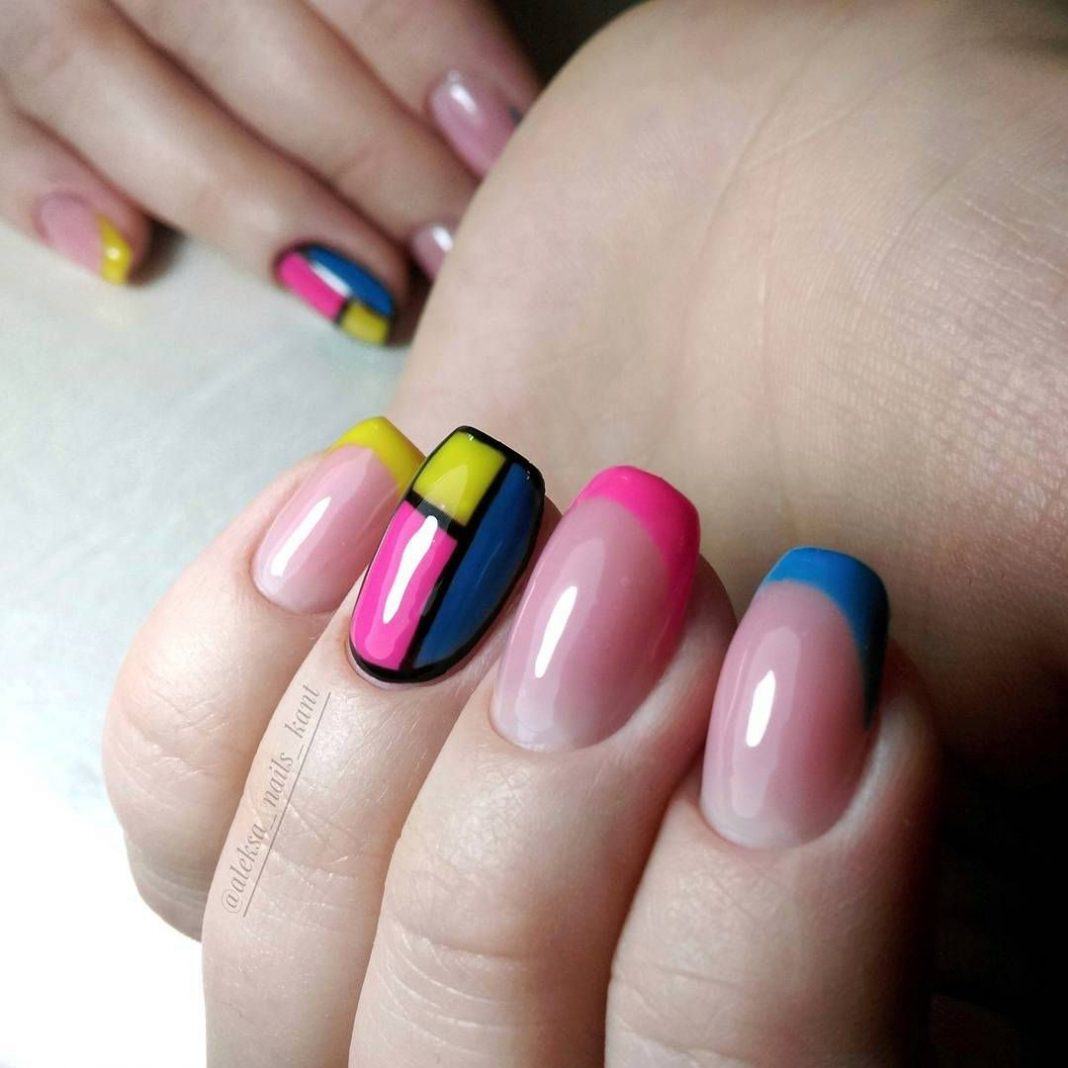 Разноцветные нейл-арты отлично сочетаются с геометрическими формами. Их можно выполнять на 1 акцентном пальце или распределить по всем ноготкам сразу. Основной акцент в цветном дизайне с геометрией сделан на край ногтевой пластины.