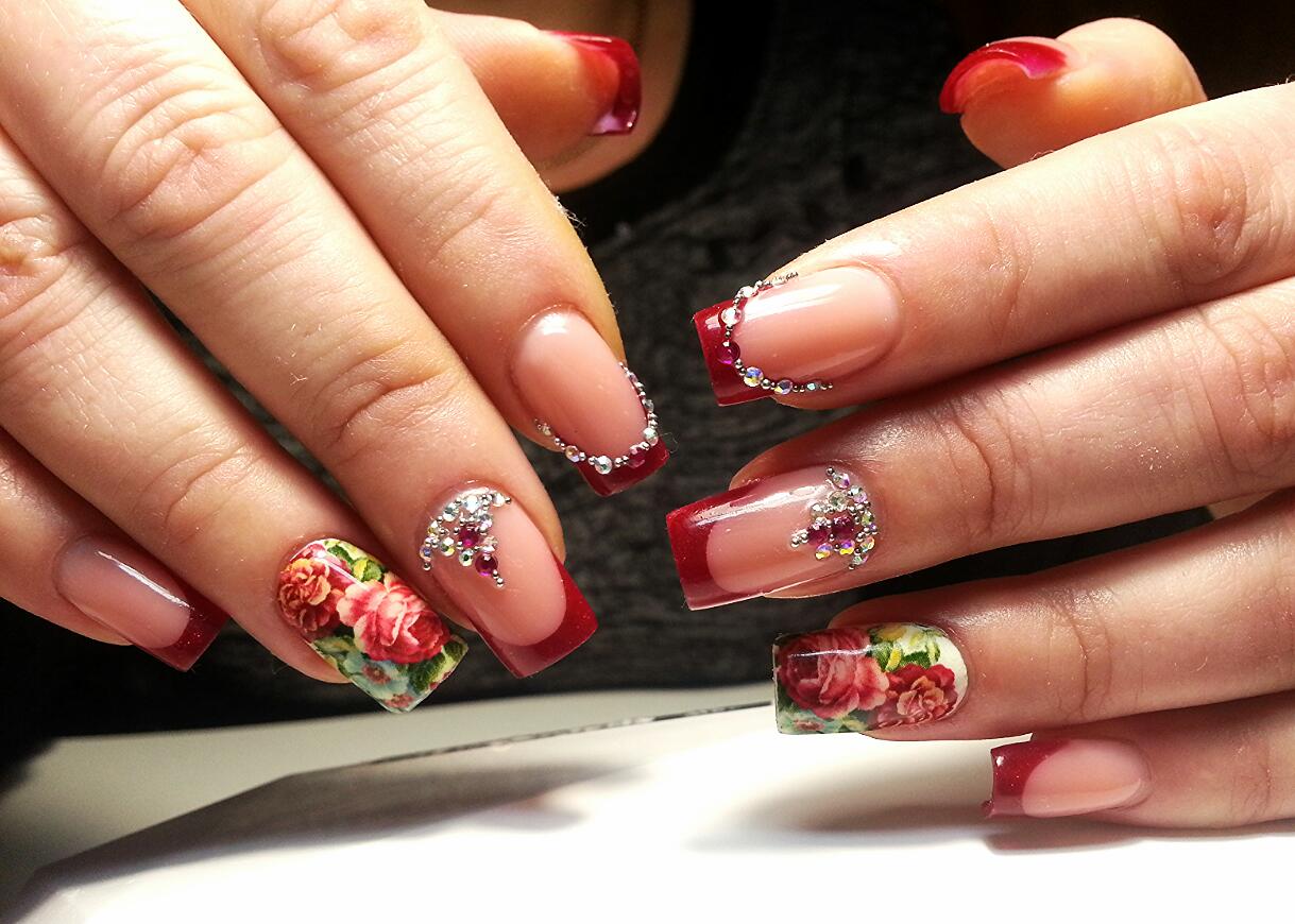 Для романтичных и изящных женских натур идеально подойдет французский маникюр, имеющий в себе цветочный принт. Именно этот вариант имеет линию улыбки, нанесенной в виде мелких цветочков и лепестков. Данная версия маникюра отлично будет гармонировать с летним и воздушным сарафаном. К тому же такой дизайн ногтей можно использовать даже в холодное время года. Особенно если стиль одежды имеет также цветочный рисунок. Тем более, что для выполнения бутонов можно использовать различные цветовые оттенки лакового покрытия или даже одновременно сочетать сразу несколько цветов.