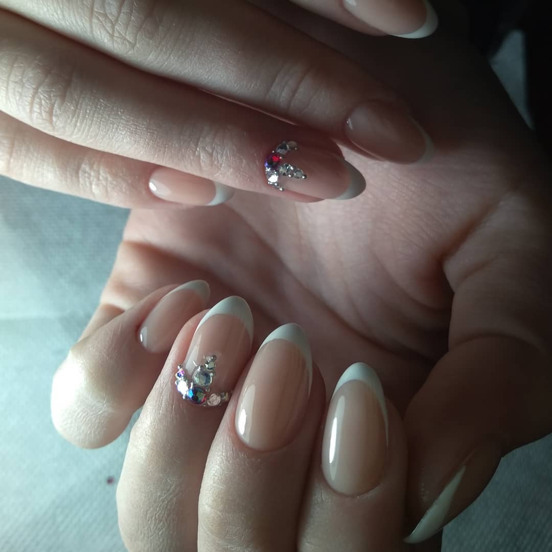 - стразы и другой блестящий декор – выглядят привлекательно в любом маникюре, и короткие ноготки не исключение.