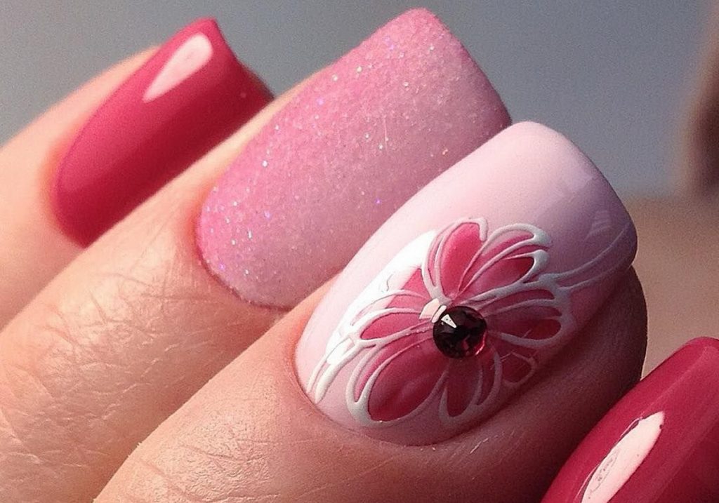 Маникюр с цветочными принтами непременно акцентируется стразами. Они вкрапляются в основной декор, украшая сердцевинку орнаментов. Выбирайте калоритные летние цветочки, которые своим видом будут веселить вас и заряжать волнующим настроением на весь денек.