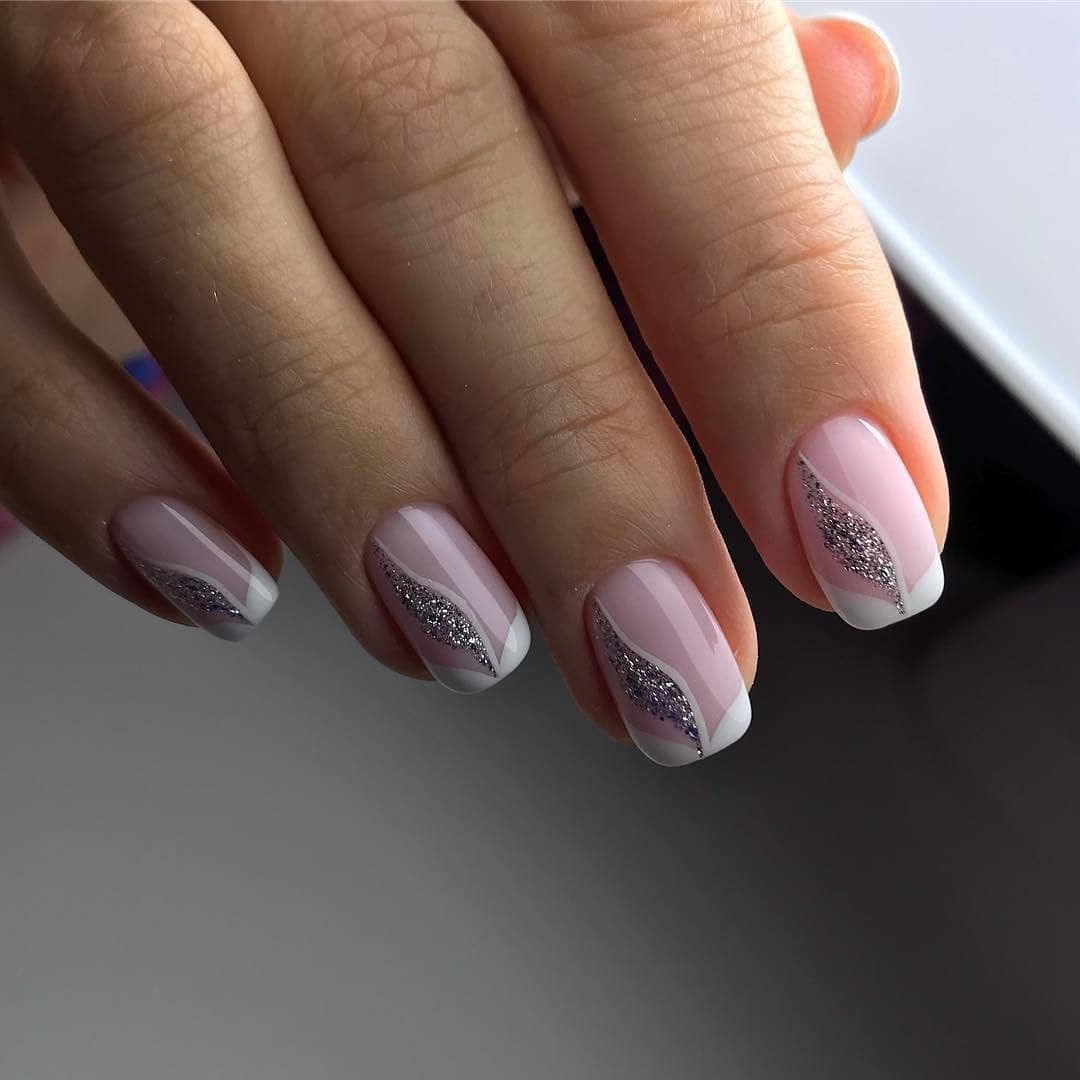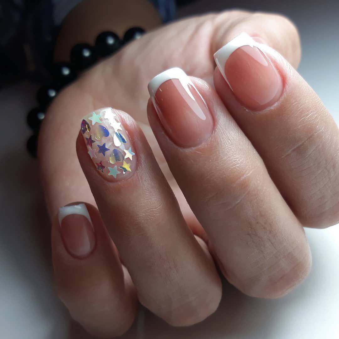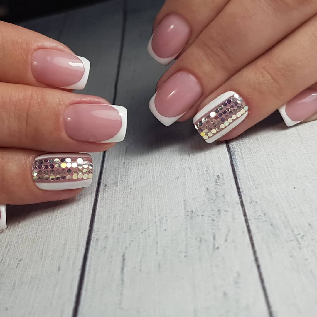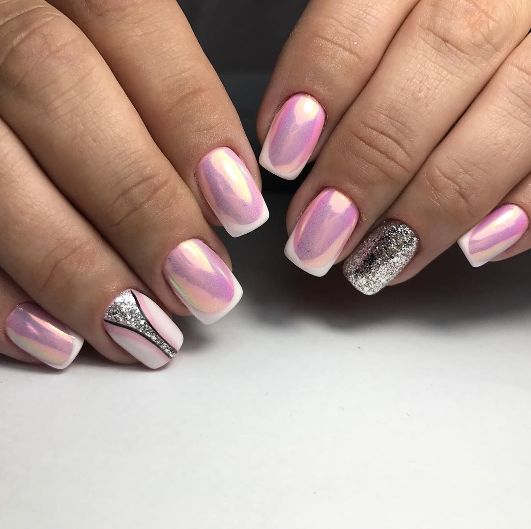 Ну кто не любит блёстки? Большие и маленькие, серебряные и золотые. Нежный маникюр — не повод от них оказывается, особенно если впереди значимое мероприятие и вам нужно выглядеть неотразимо. Можно сделать растяжку:
