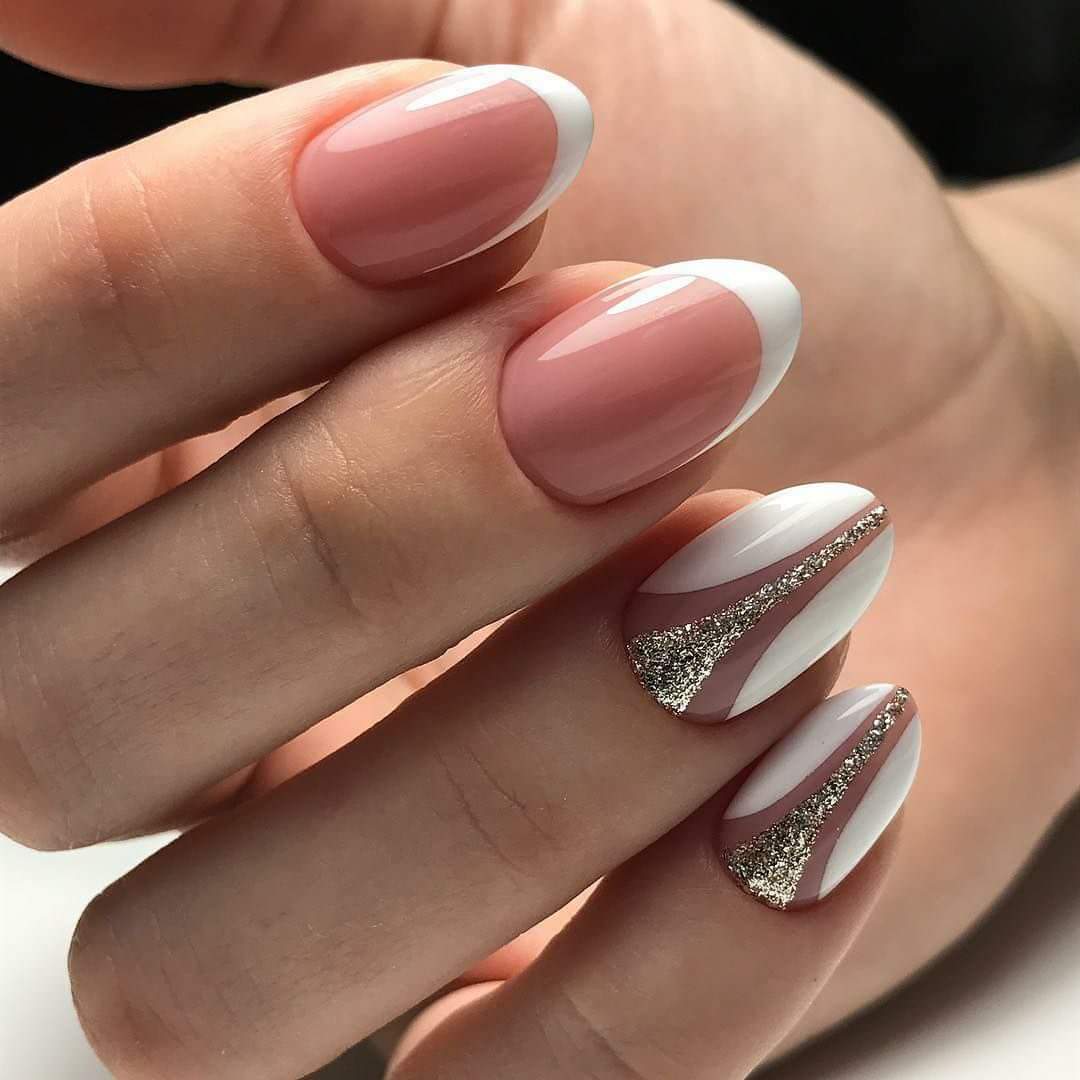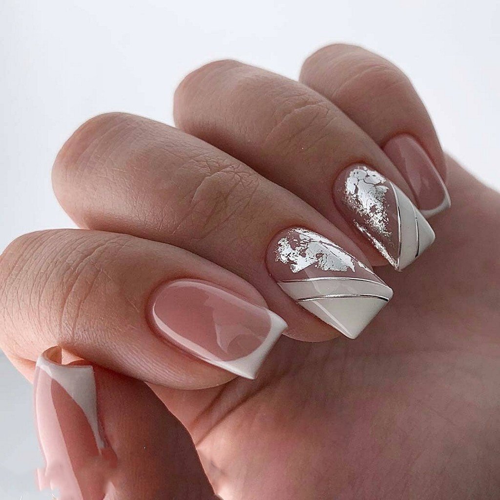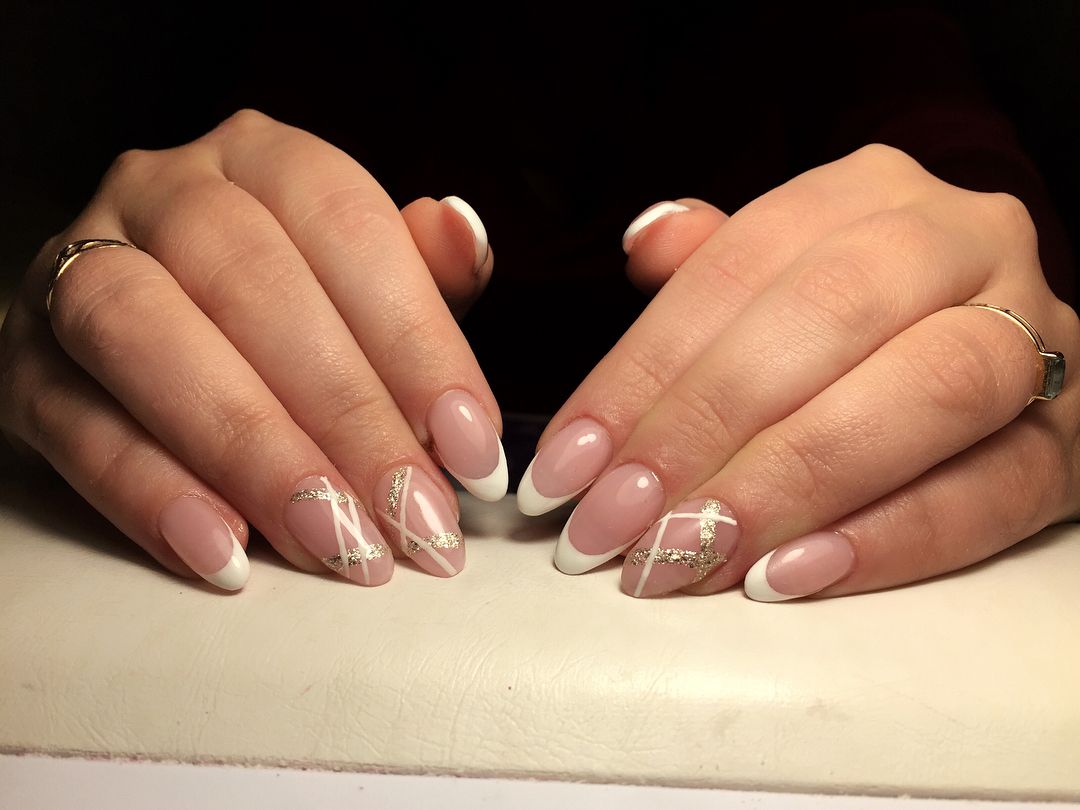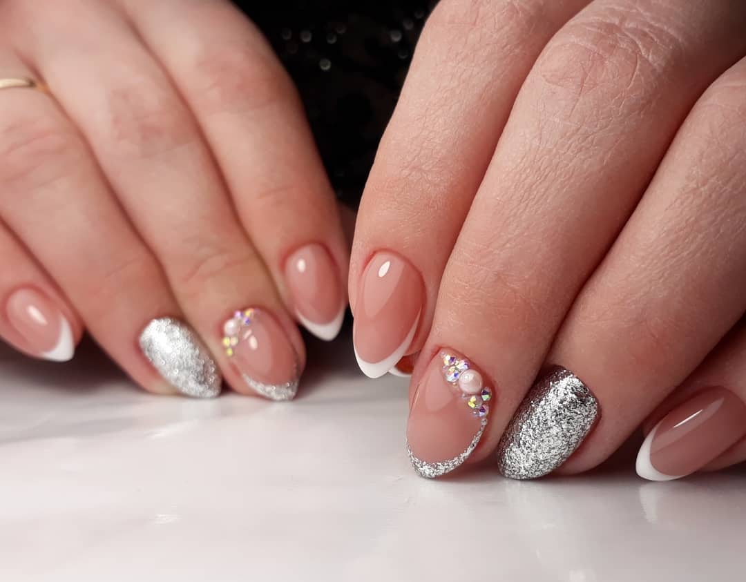 Ну кто не любит блёстки? Большие и маленькие, серебряные и золотые. Нежный маникюр — не повод от них оказывается, особенно если впереди значимое мероприятие и вам нужно выглядеть неотразимо. Можно сделать растяжку: