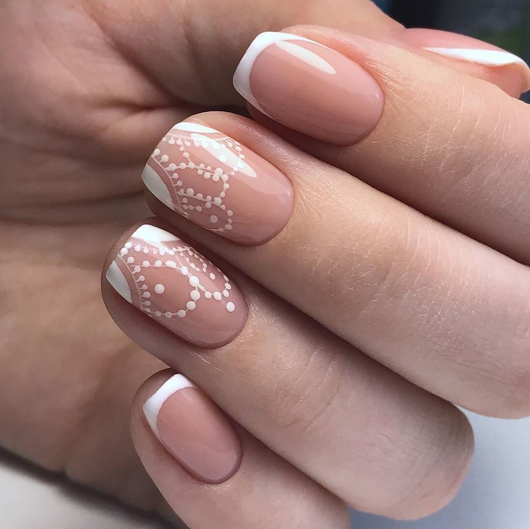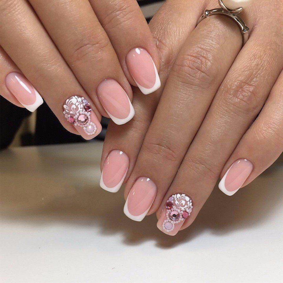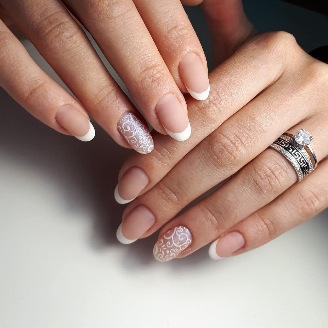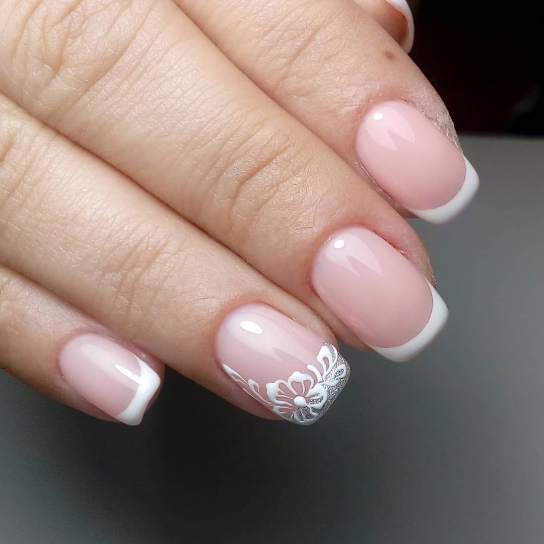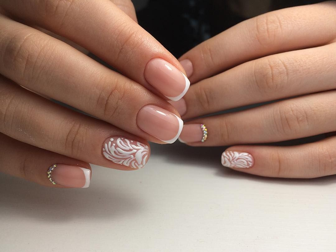При желании маникюр можно дополнить кружевными вставками, а также цветочными мотивами. Считается, что именно такой дизайн лучше всего подходит для торжественных событий. Уместным будет градиент на нескольких ноготках, а также дополнительный декор в виде стразов, блесток, фольги или втирки. Каждый из вариантов является стильным решением для свадебного маникюра.
