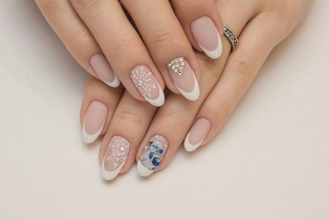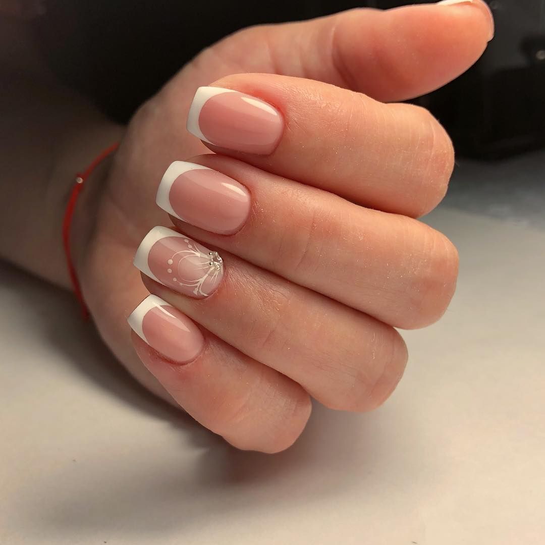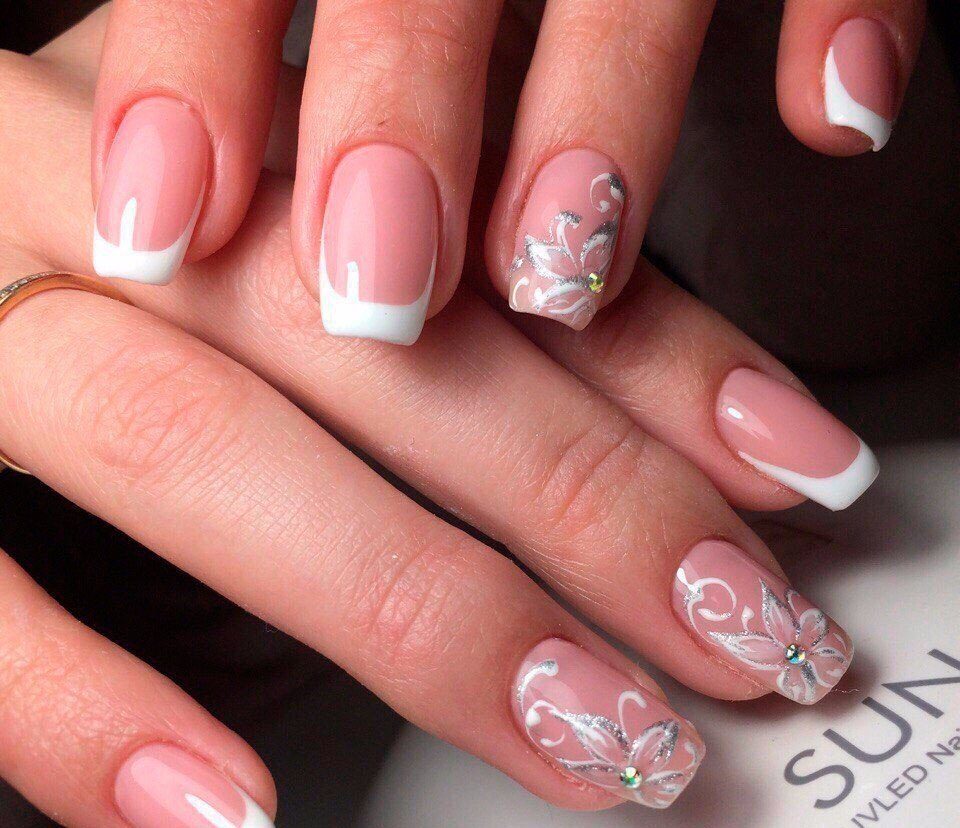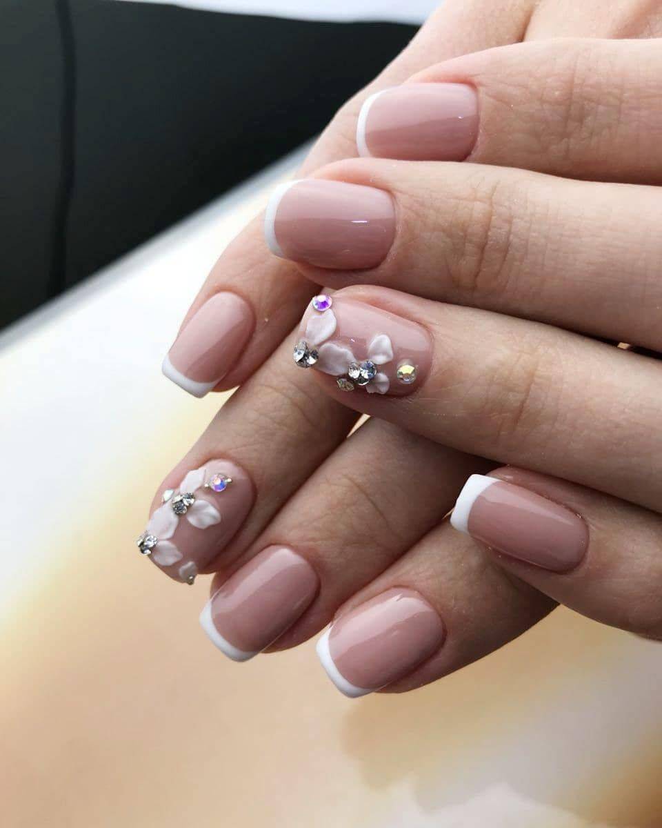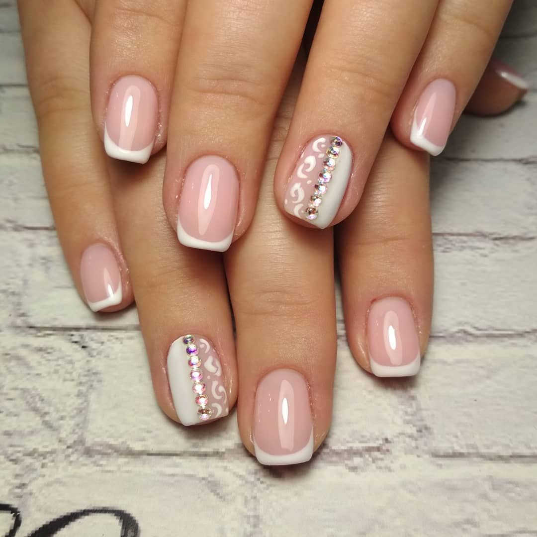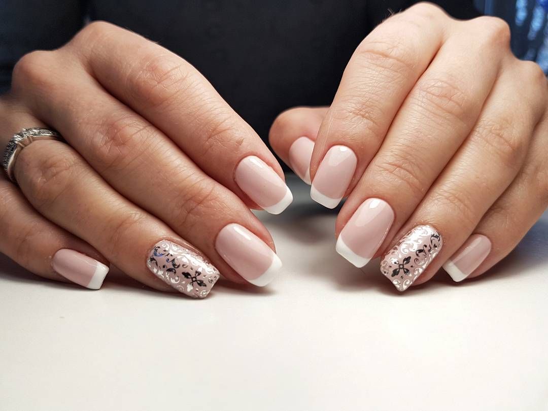 При желании маникюр можно дополнить кружевными вставками, а также цветочными мотивами. Считается, что именно такой дизайн лучше всего подходит для торжественных событий. Уместным будет градиент на нескольких ноготках, а также дополнительный декор в виде стразов, блесток, фольги или втирки. Каждый из вариантов является стильным решением для свадебного маникюра.