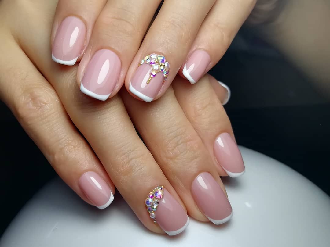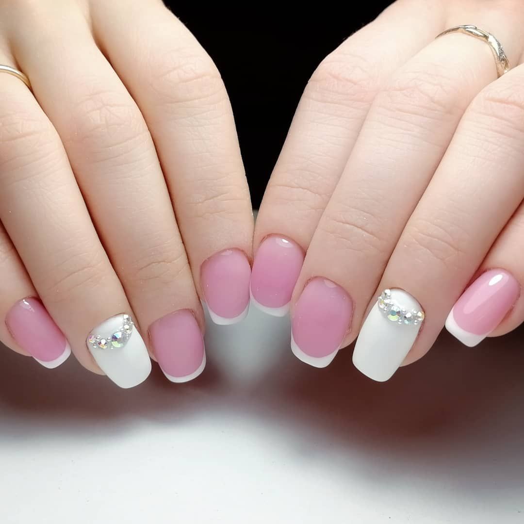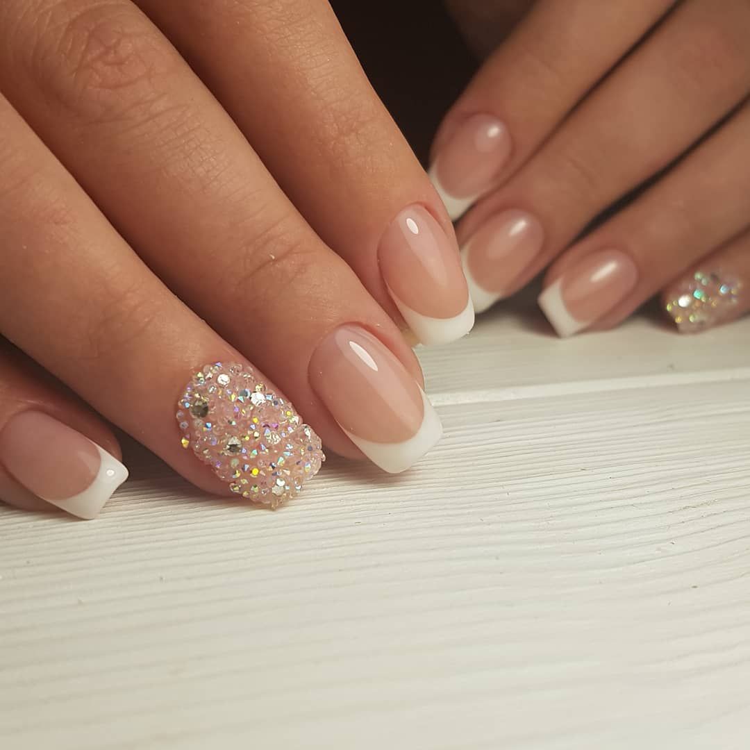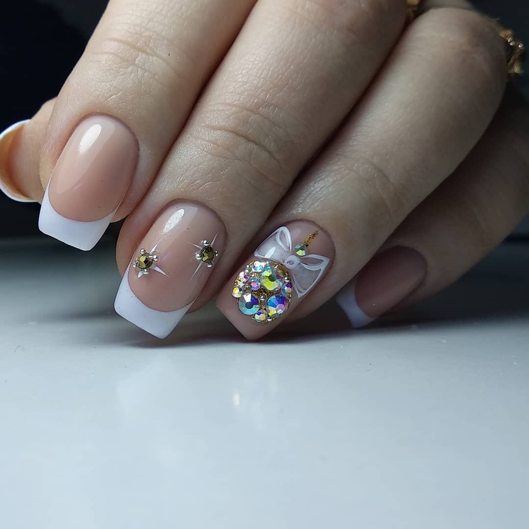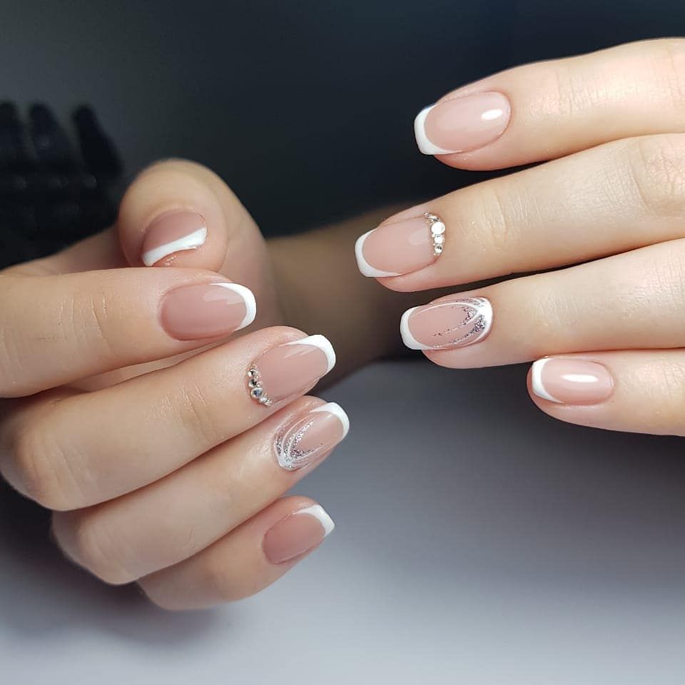 При желании маникюр можно дополнить кружевными вставками, а также цветочными мотивами. Считается, что именно такой дизайн лучше всего подходит для торжественных событий. Уместным будет градиент на нескольких ноготках, а также дополнительный декор в виде стразов, блесток, фольги или втирки. Каждый из вариантов является стильным решением для свадебного маникюра.