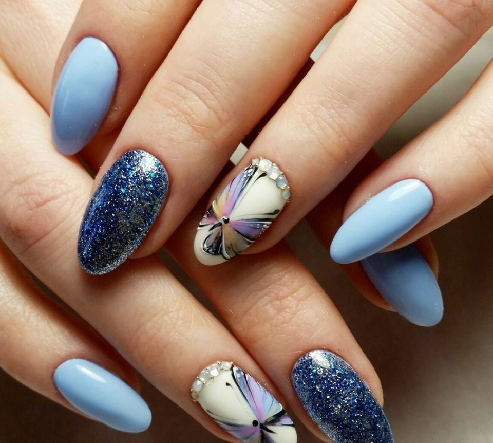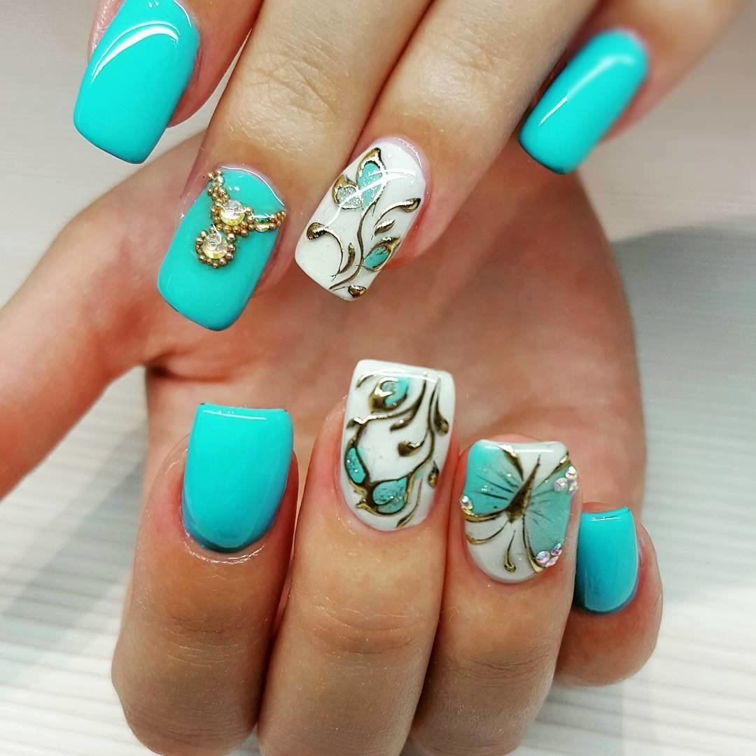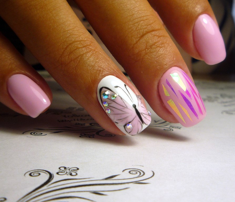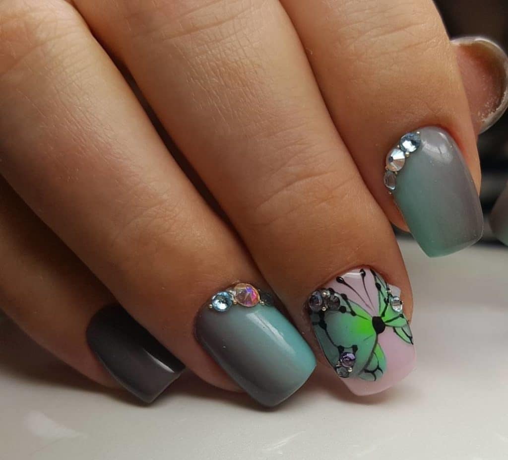 - Комбинированная бабочка. Отличный вариант весеннего или летнего маникюра — бабочка, нарисованная кистью и дополненная камнями. Красивое сочетание декоративных элементов изящно дополняет ваш маникюр.