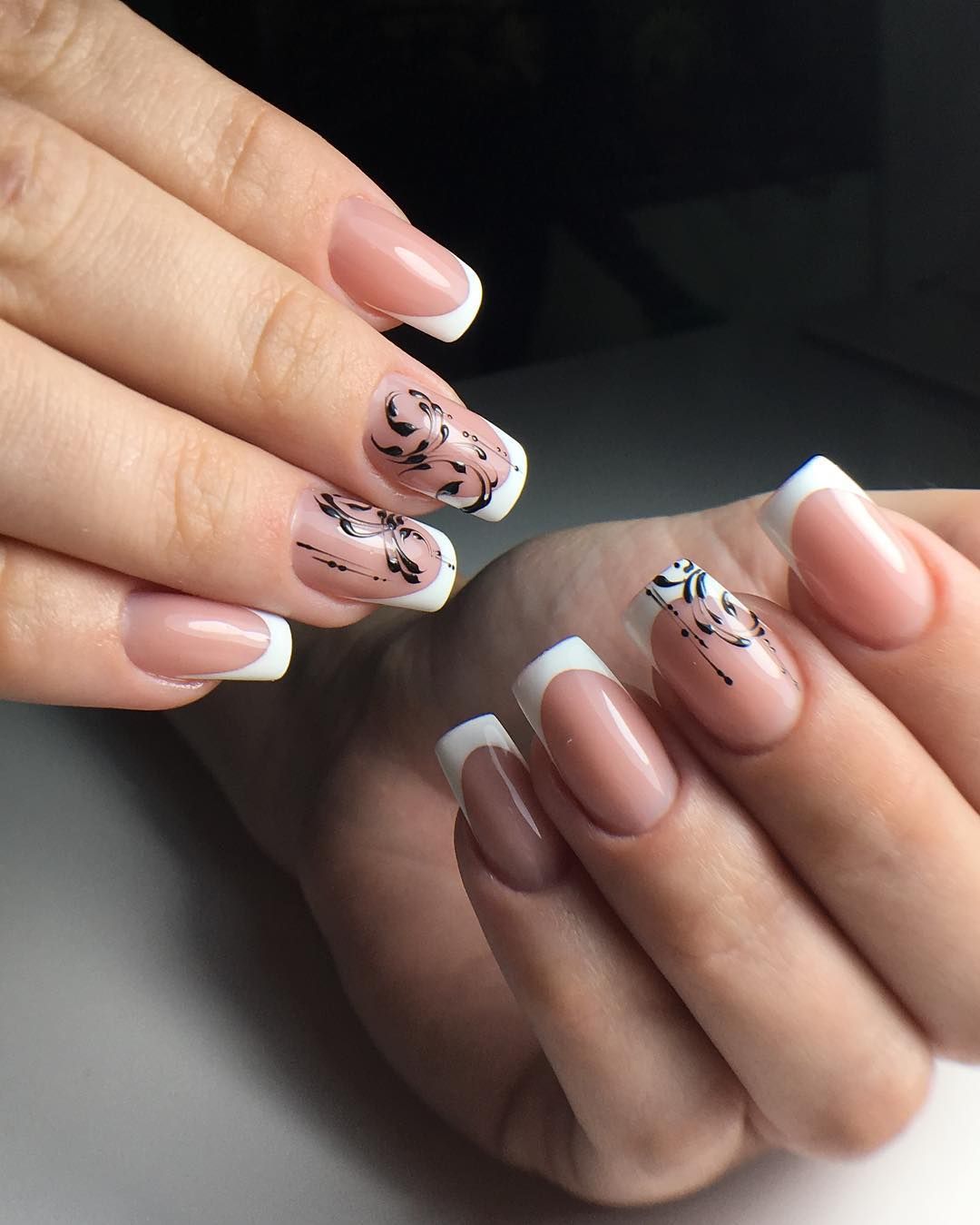 - Элегантный маникюр с рисунком — рисунки могут быть самыми разнообразными, очень красиво смотрятся рисунки с силуэтами, цветами, абстракция, разные узоры.