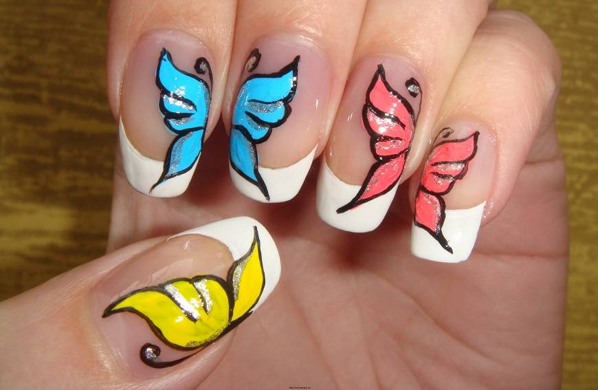 Попробуйте превратить свои кончики пальцев в крылья прекрасной порхающей бабочки. При этом цвет крыльев можете выбирать на свой вкус, достаточно красиво смотрятся оранжевые, голубые или красные.
