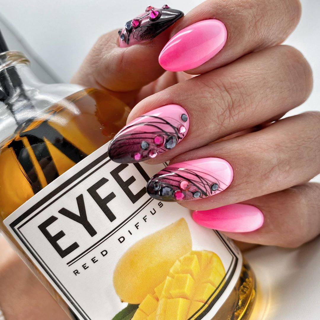 - Яркая бабочка из камней и страз. Такой дизайн смотрится по-королевски. Ногти выглядят дорого и роскошно. Особенно красиво бабочка из камней смотрится на крупной ногтевой пластине. Ведь её крыльям нужен хороший размах. Для создания шедевра мастер использует камни разного размера и оттенка.