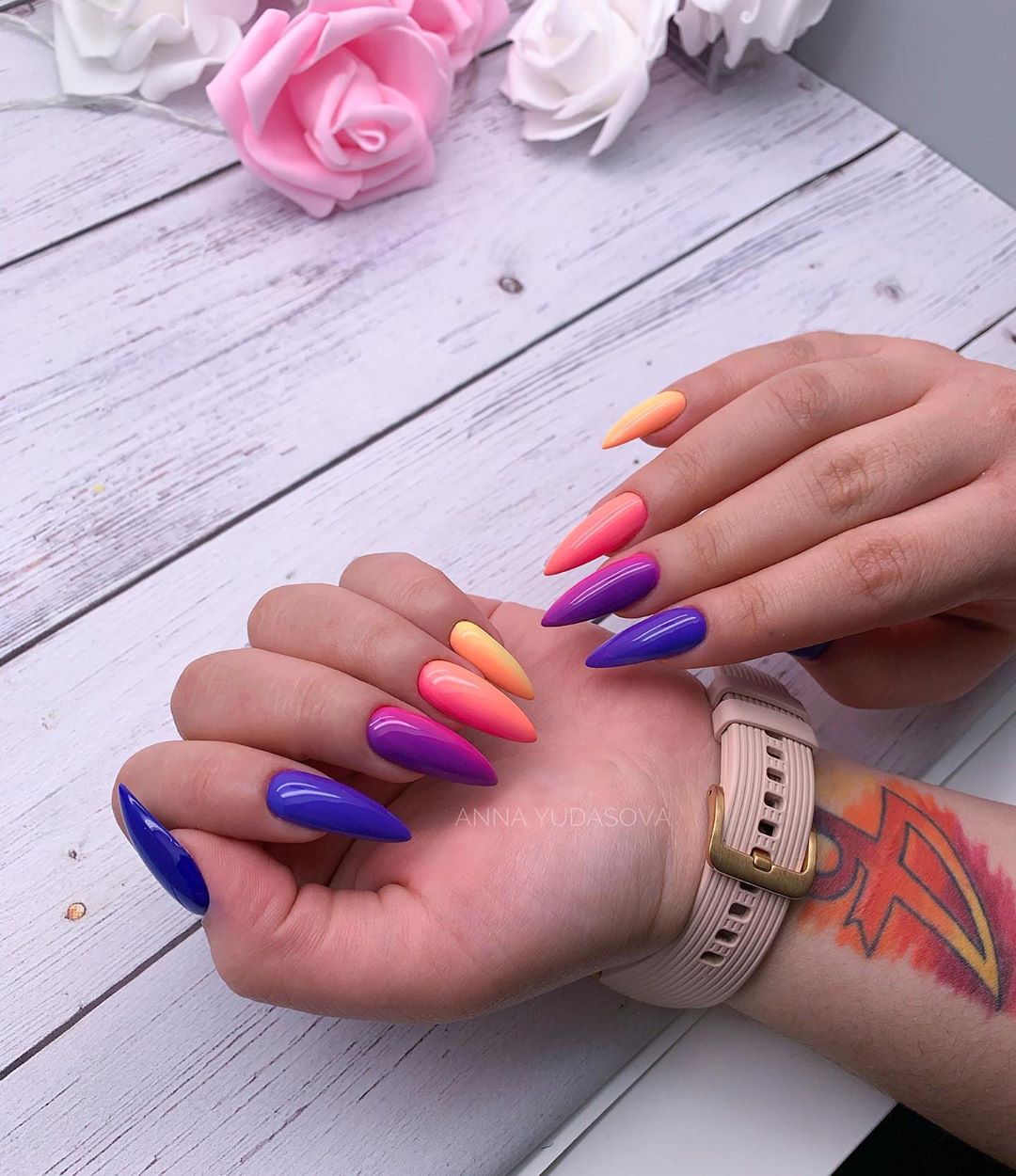 Переходы от одного цвета к другому всегда смотрятся интересно. Особенно, если использовать необычные цвета. Можно сделать градиент на всех ноготках или наоборот только на одном.