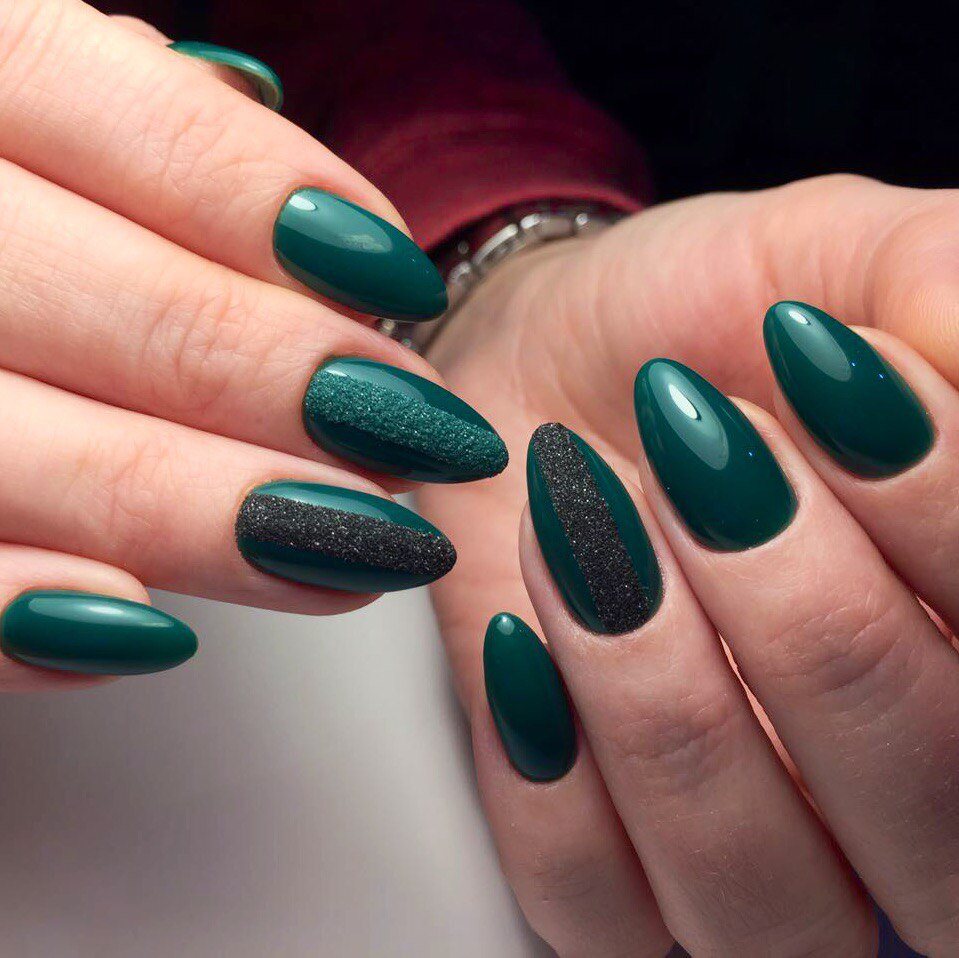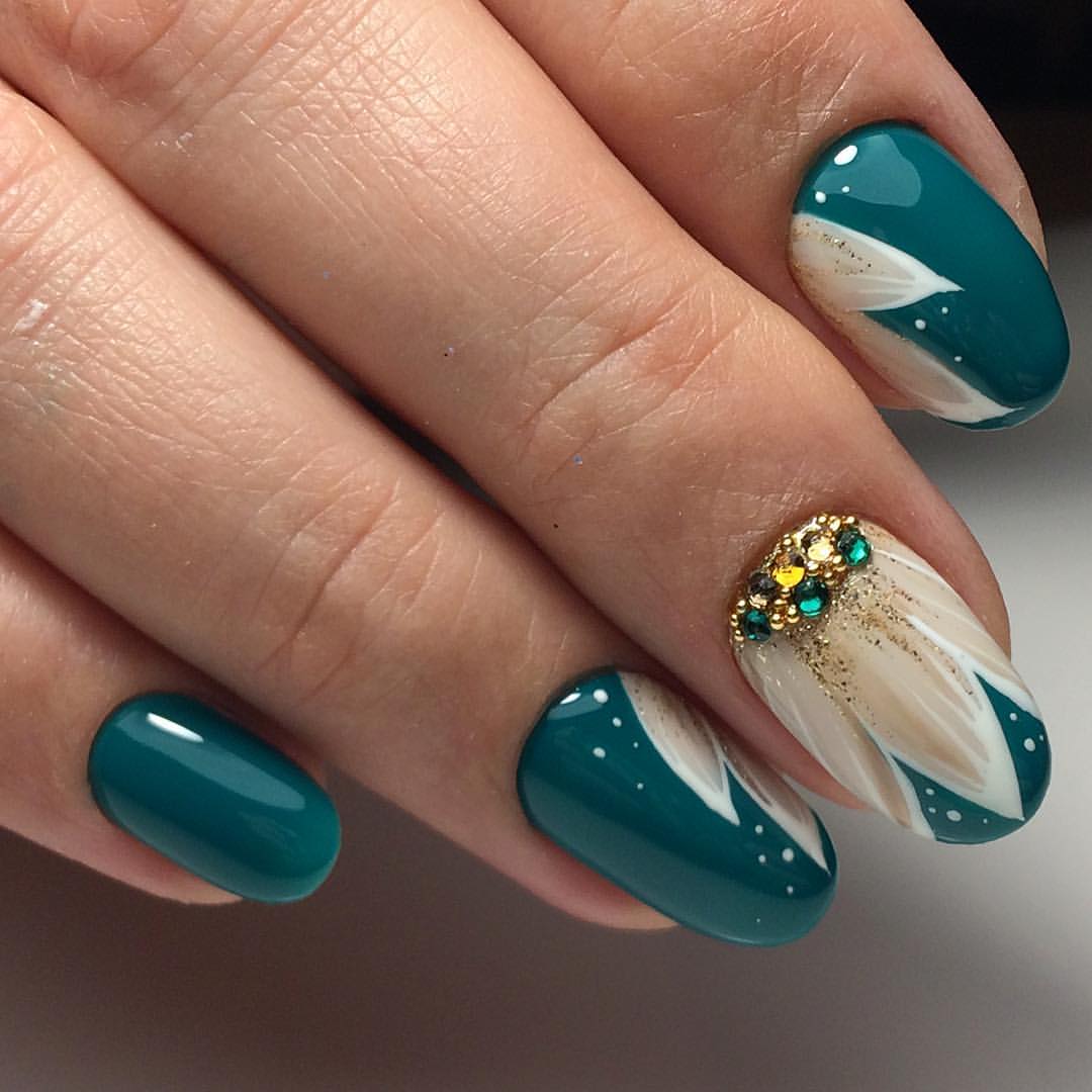 Осенний маникюр прекрасен с использованием глубоких насыщенных оттенков синего, бордового и изумрудного цветов.