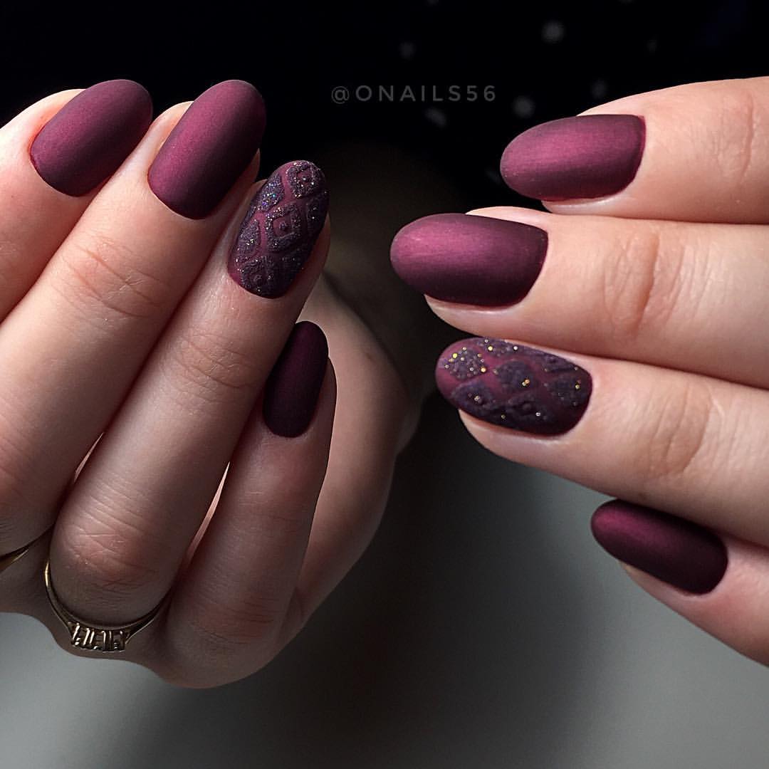 Матовые покрытия позволяют создавать всевозможные оригинальные комбинации. С их помощью можно выполнить однородные по цвету и текстуре маникюр, френч, омбре, лунный и прочие виды маникюра. Но наибольшей популярностью отличается сочетание матовой и глянцевой поверхности в форме всевозможных рисунков и орнаментов. Эффектно смотрится глянцевая имитация кружева, нанесенная поверх матового однородного фона.