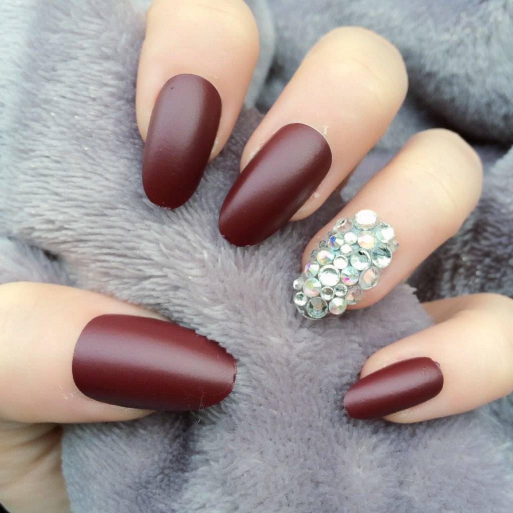 Для вечернего выхода или мероприятия можно смело использовать темные оттенки, как основное покрытие. Но в данном случае лучше обойтись без рисунка, а украсить несколько ноготков небольшим количеством страз или бусин. Такое сочетание всегда выглядит особенно элегантно.