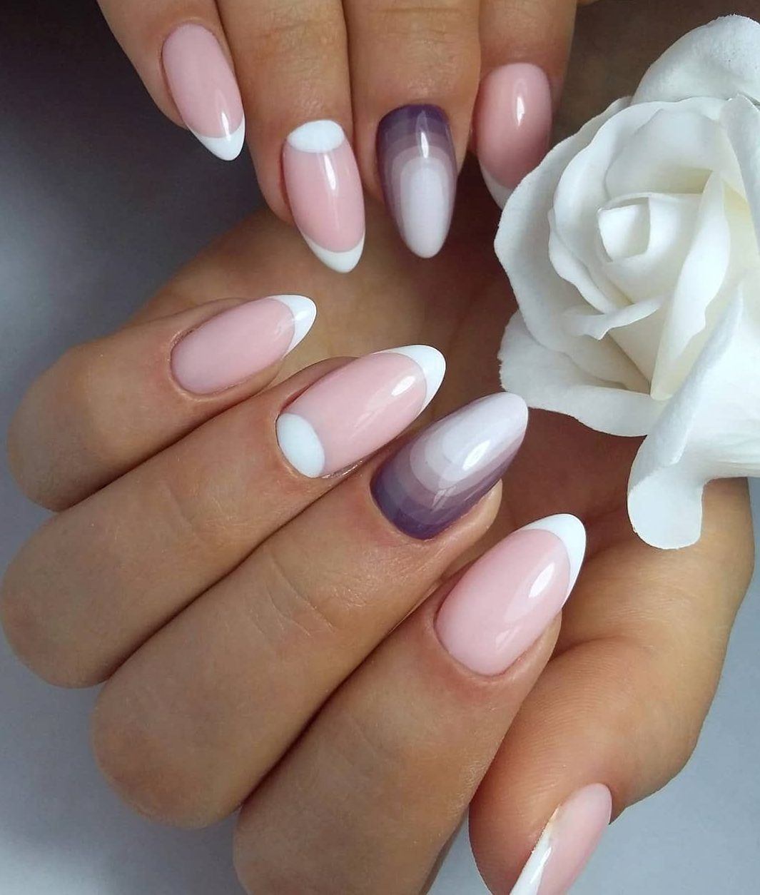 Если вы предпочитаете французский маникюр в яркой цветовой гамме, то не скупитесь на эксперименты. На овальной форме красиво будут смотреться пастельные тона, такие как розовый, песочный, мята, небесно-голубой, сиреневый. Попробуйте также насыщенные цвета, например чёрный или тёмную вишню. Они тоже будут выигрывать.