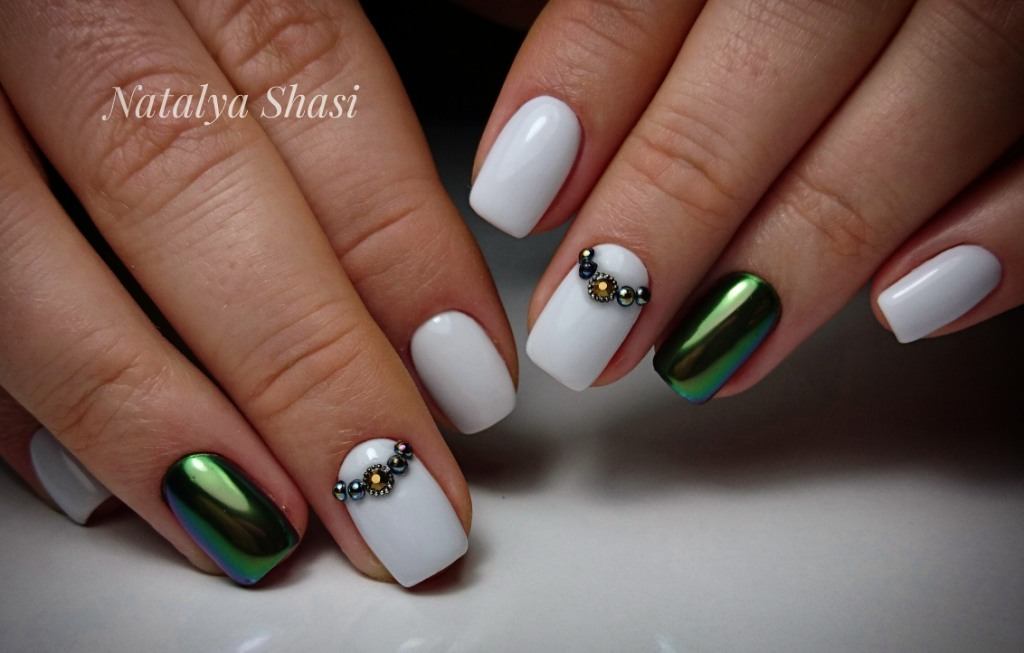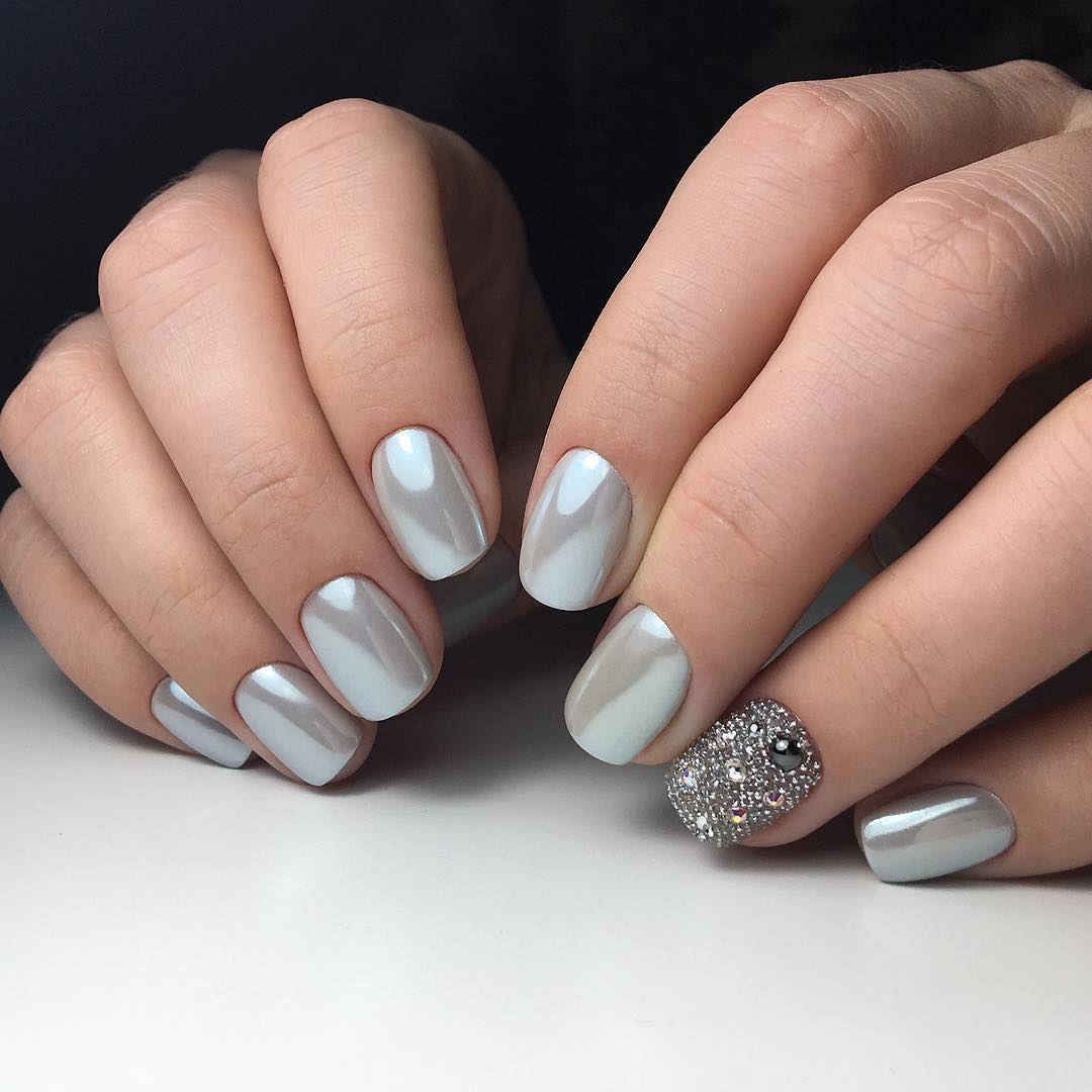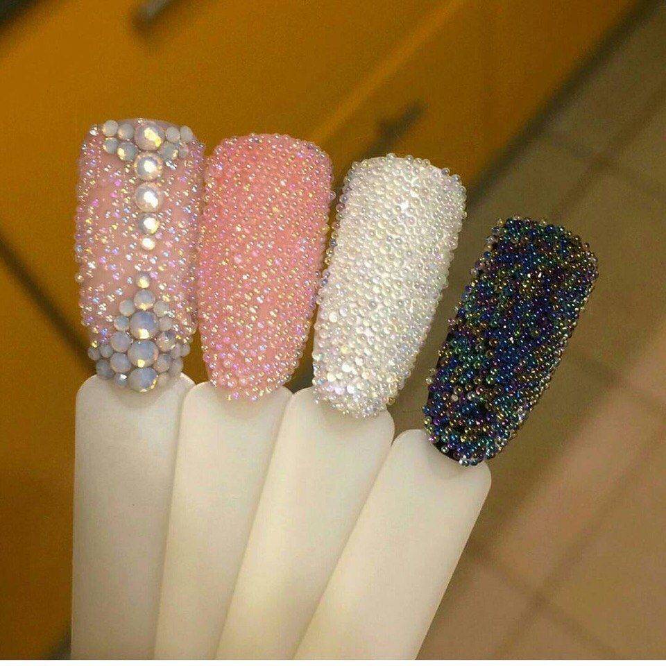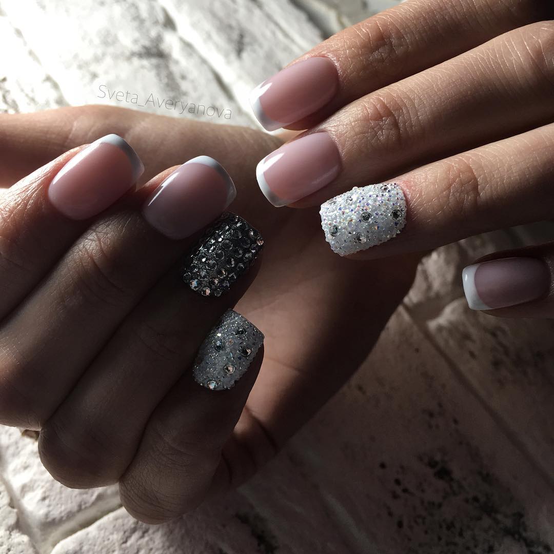 Абсолютный мастхэв в нейл индустрии – это маникюр с бульонками и стразами как на фото. Это универсальное сочетание, с помощью которого можно создавать различные праздничные дизайны. Бульонки идеально дополнят стразы и наоборот, поэтому не бойтесь использовать их одновременно в одном маникюре.