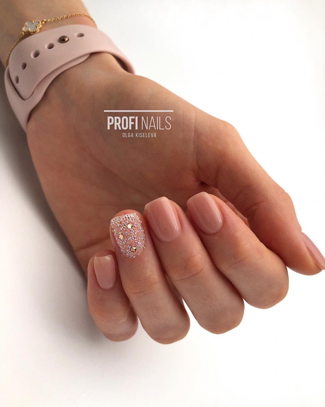Бульонки прекрасно сочетаются со стразами. Такой дизайн придаст праздничности и отлично смотрится на любом торжестве, будь то Новый год или свадьба. Стразы не добавляют сложности, делать маникюр всё так же легко и совсем не хлопотно. Для того чтобы комбинировать бульонки со стразами, нужно нанести базу под лак и сам гель-лак.