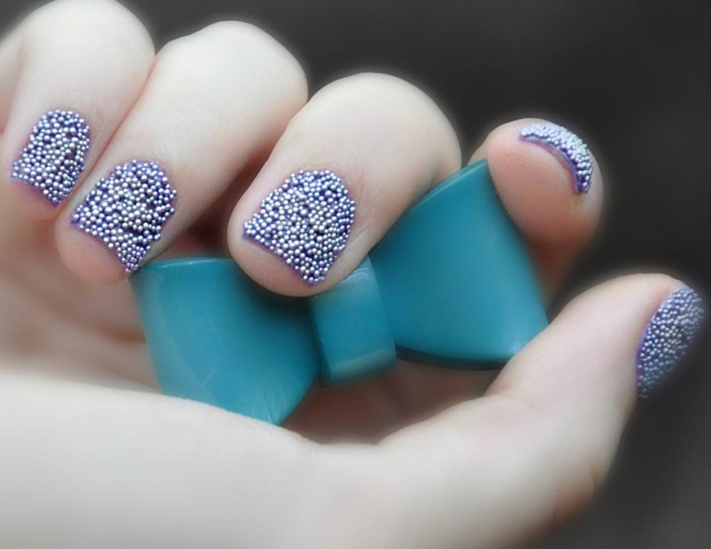 При полном покрытии всех ногтей бульонками получается икорный маникюр. Россыпь маленьких шариков выглядит поистине роскошно. Делается он проще, чем кажется. При создании маникюра с узорами из бульонок нужно скрупулезно выстраивать определенную последовательность шариков. А при икорном маникюре ногти с еще не высохшим лаком просто опускают в емкость с бульонками. Остается только закрепить результат и вуа-ля! – шикарный маникюр готов.