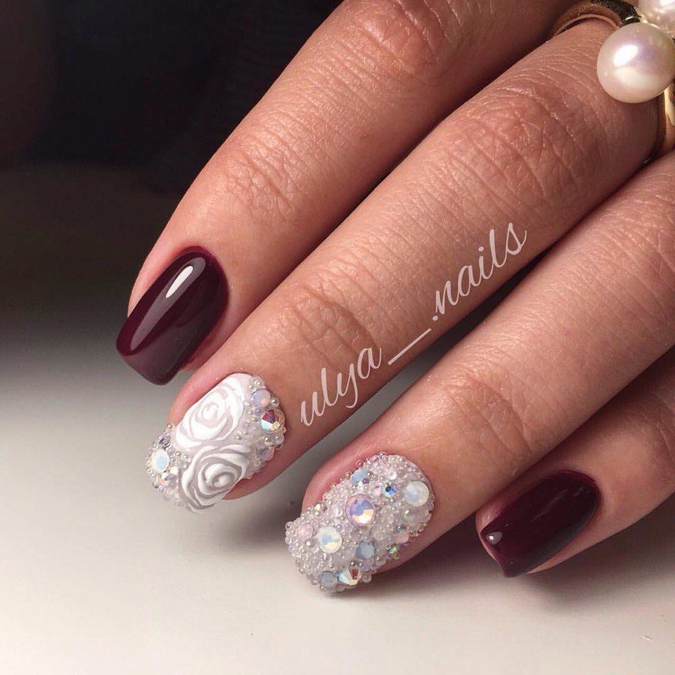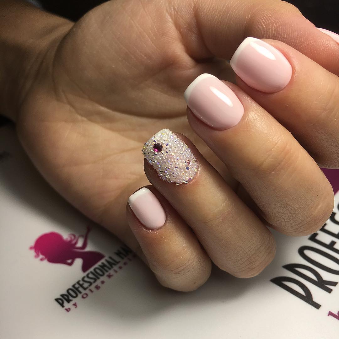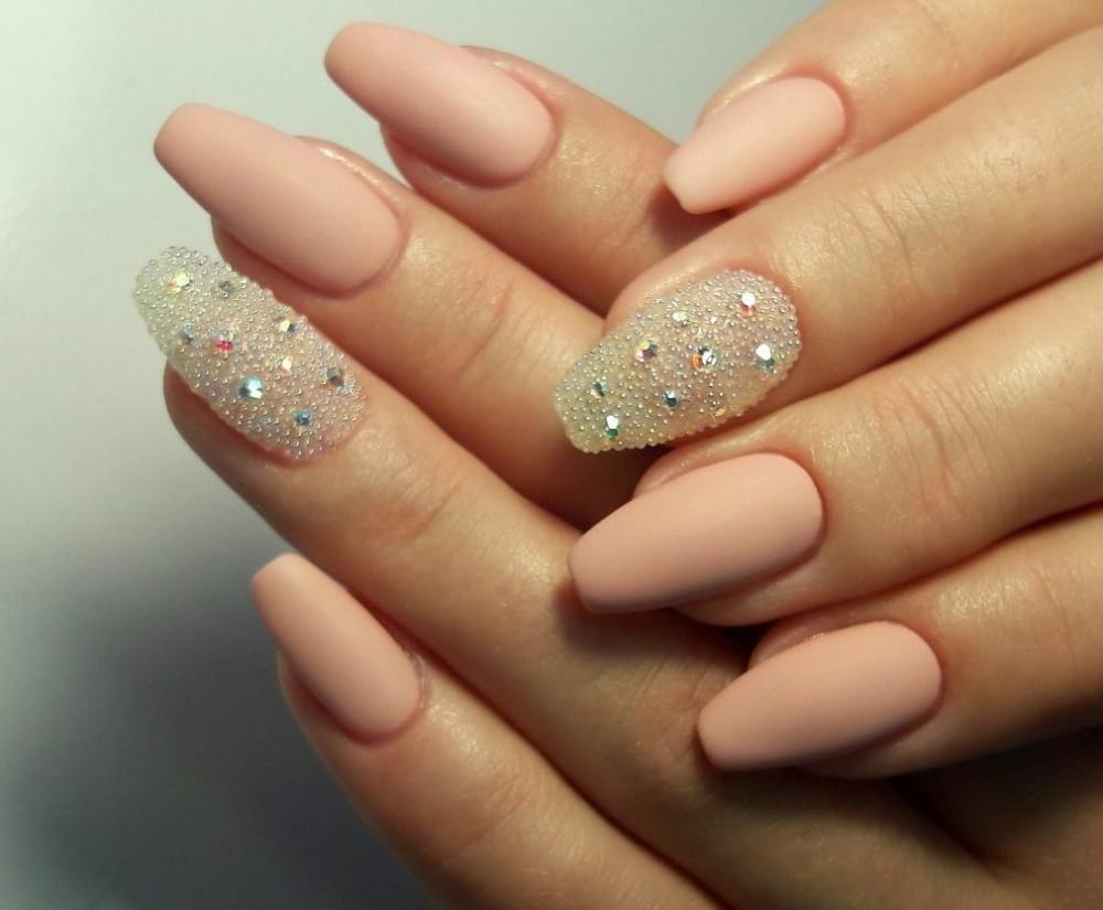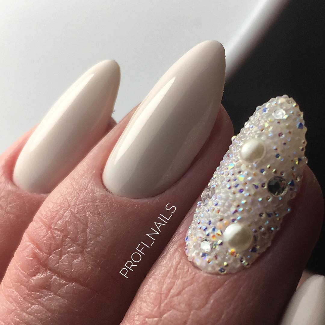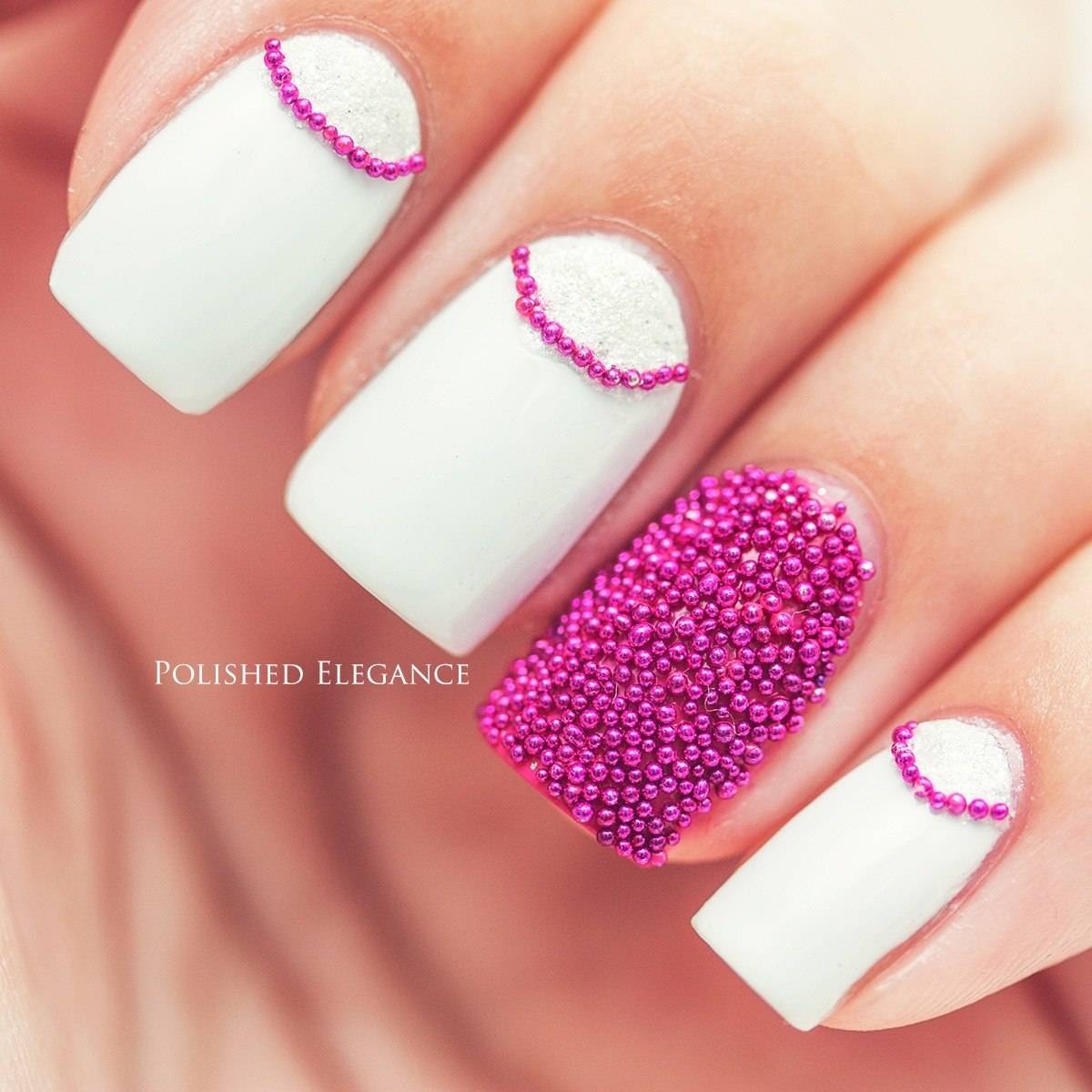 Маникюр с бульонками подойдет на все случаи жизни. Например, мелкие шарики в комбинации со стразами и основой белого цвета будут отлично сочетаться со свадебным платьем невесты и идеально подходят для этого торжества.