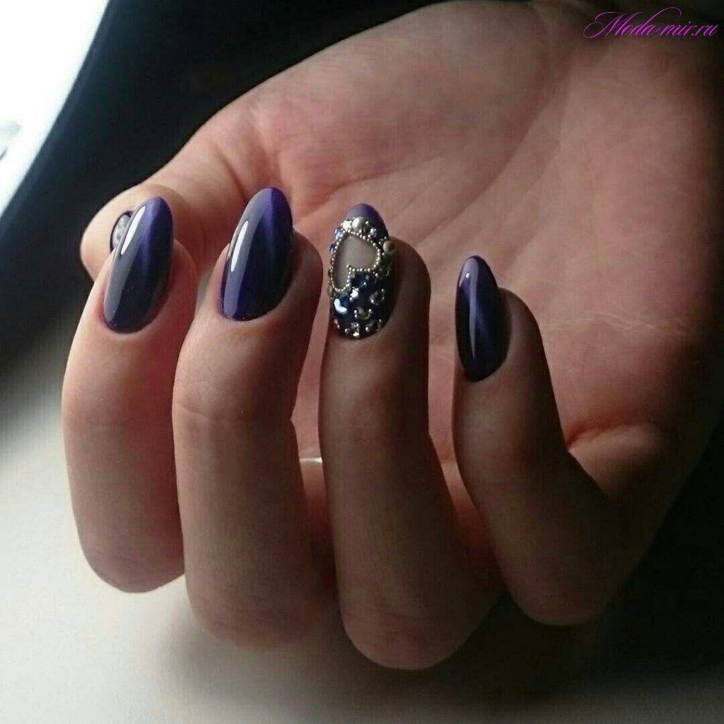 Украшают два ногтя, плотно покрывая их стразами разной величины. Подойдут стразы Сваровски, их можно приобрести в наборе. По центру, ближе к кутикуле, ставят самый крупный камень. Возле него по обеим сторонам камни помельче.