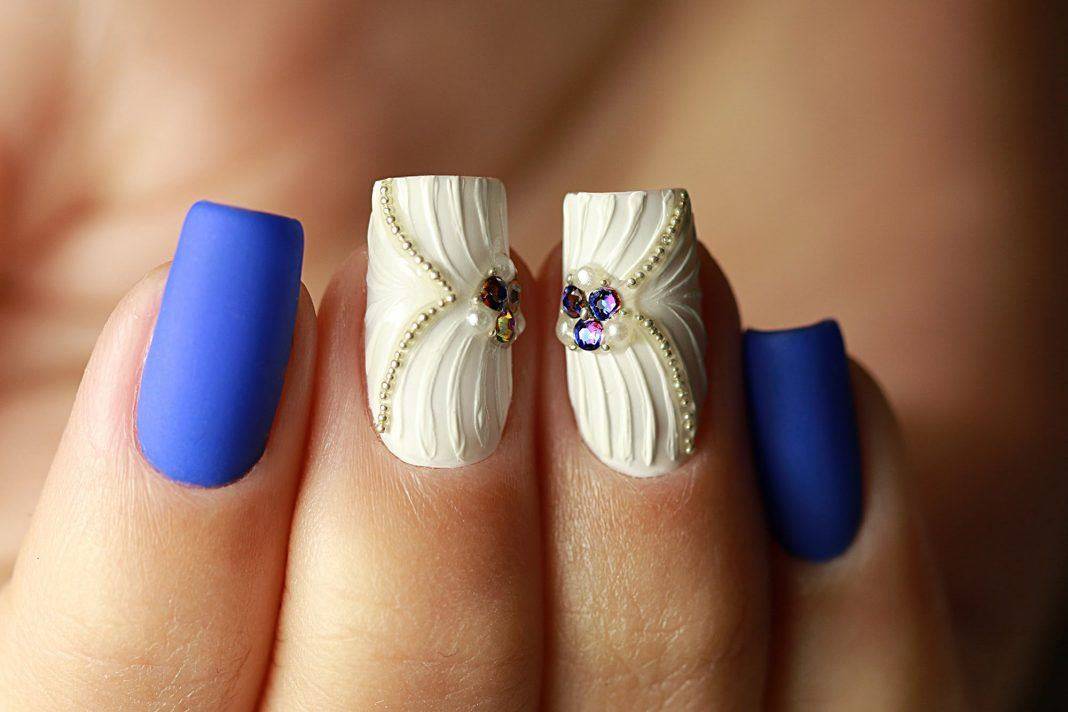 Дождавшись полного высыхания, распределяем клей для декора там, где хотим прикрепить бульонки и стразы. Затем, используя пинцет, крепим элементы декора. Можно делать это в виде рисунка, где более крупный страз находится в середине, а мелкие бульонки крепятся вокруг него. Не забываем в конце покрыть финишным лаком для большей прочности. Используйте свою фантазию, и у вас получится интересный праздничный дизайн, придающий роскошь и блеск своей обладательнице.