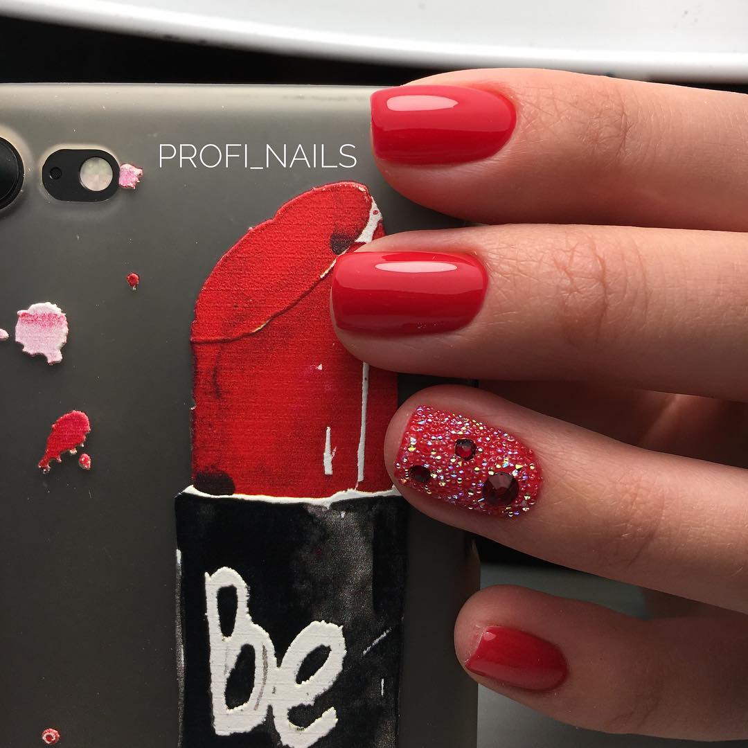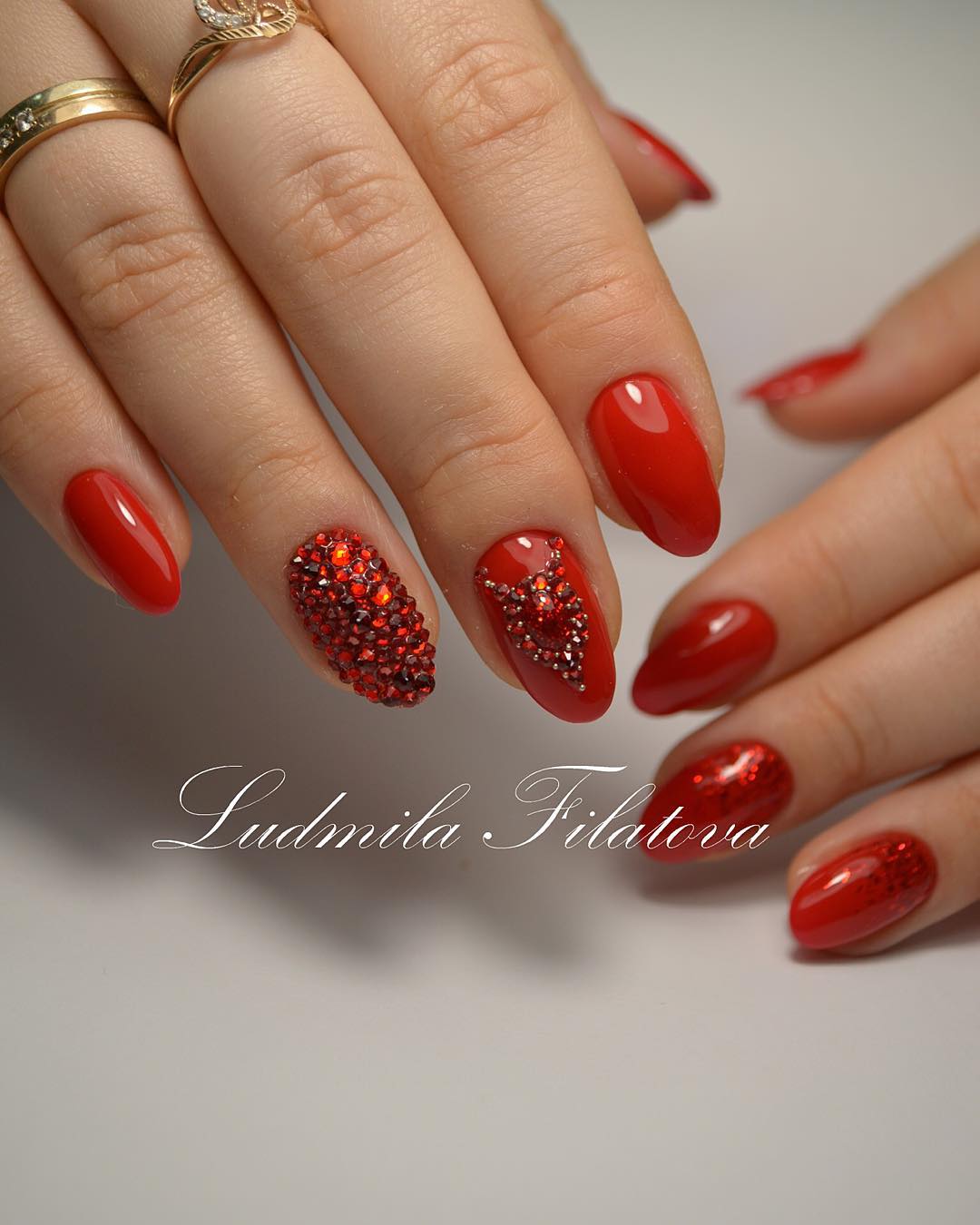 Для вечернего платья подойдет беспроигрышный красный маникюр с бульонками того же цвета.