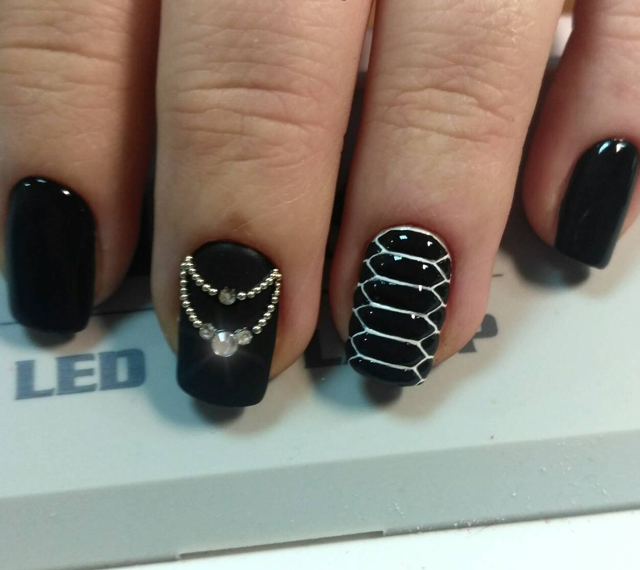 На высохшую подложку белого цвета наносят черные линии тонкой кисточкой. Есть лаки для дизайна, у них как раз такие кисточки.
