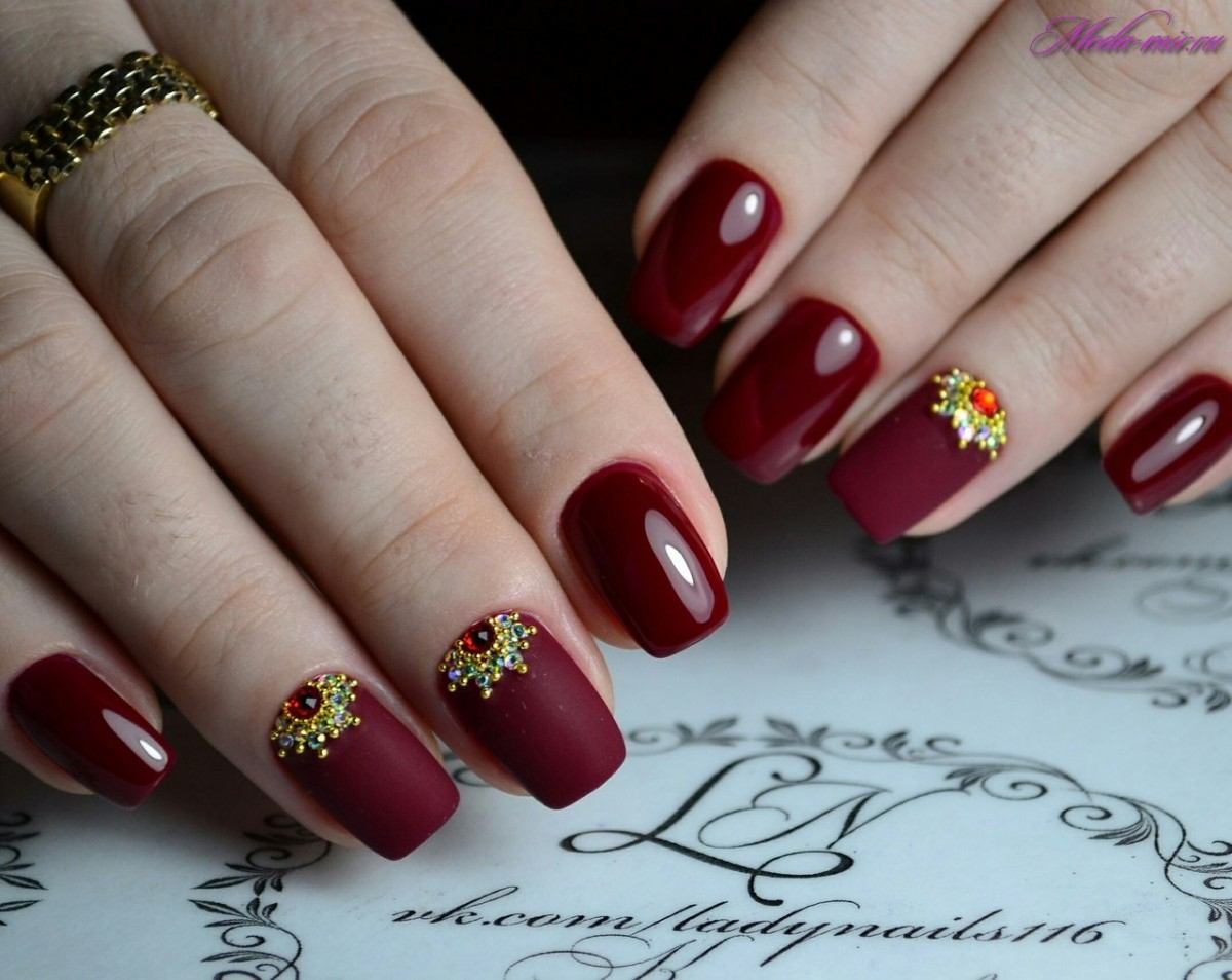 На край ногтя ставят самые мелкие камни. Пространство между крупными камнями можно заполнить золотыми бульонками. На остальные ногти в центре у кутикулы ставят по одному небольшому камню.