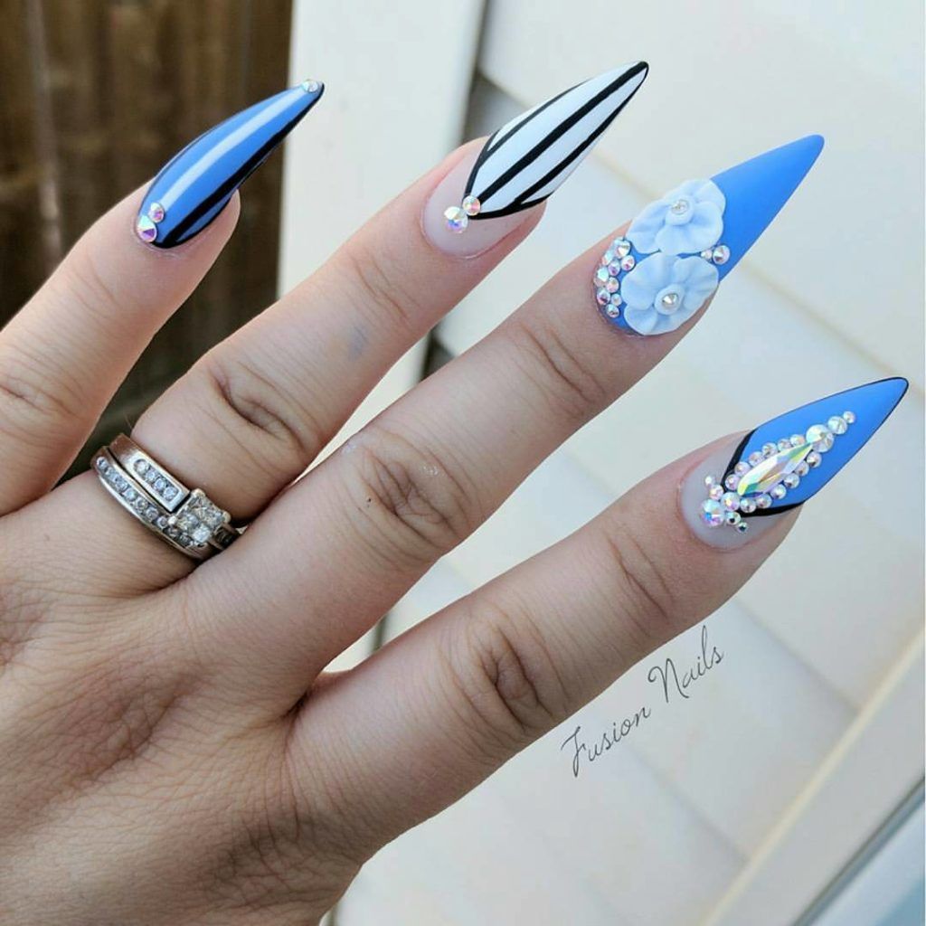 Если вы не можете устоять против сверкающего маникюра, вам придется по вкусу такой дизайн ногтей, когда основание покрыто зелеными блестками, а кончики – синим глянцем. Для лета отлично подходит полосатый рисунок в виде горизонтальных или вертикальных зеленых и синих полос.