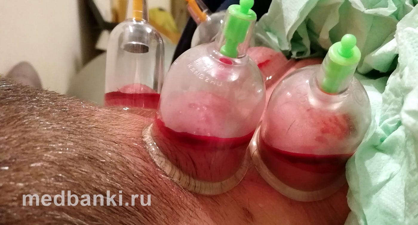- В остальном процедура осуществляется аналогичным образом: устанавливаются банки, которые высасывают застоявшуюся кровь.
