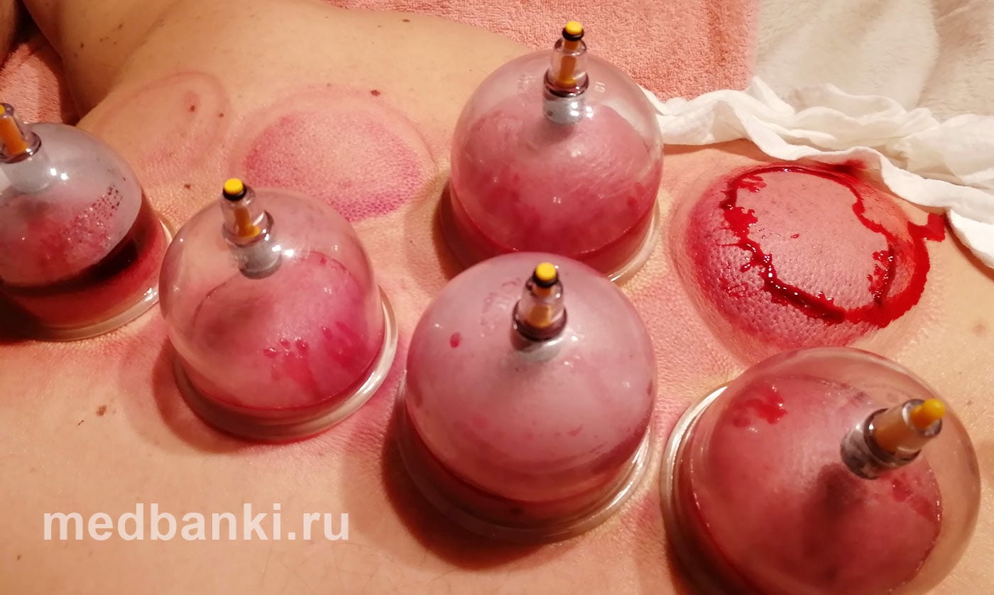 - В остальном процедура осуществляется аналогичным образом: устанавливаются банки, которые высасывают застоявшуюся кровь.