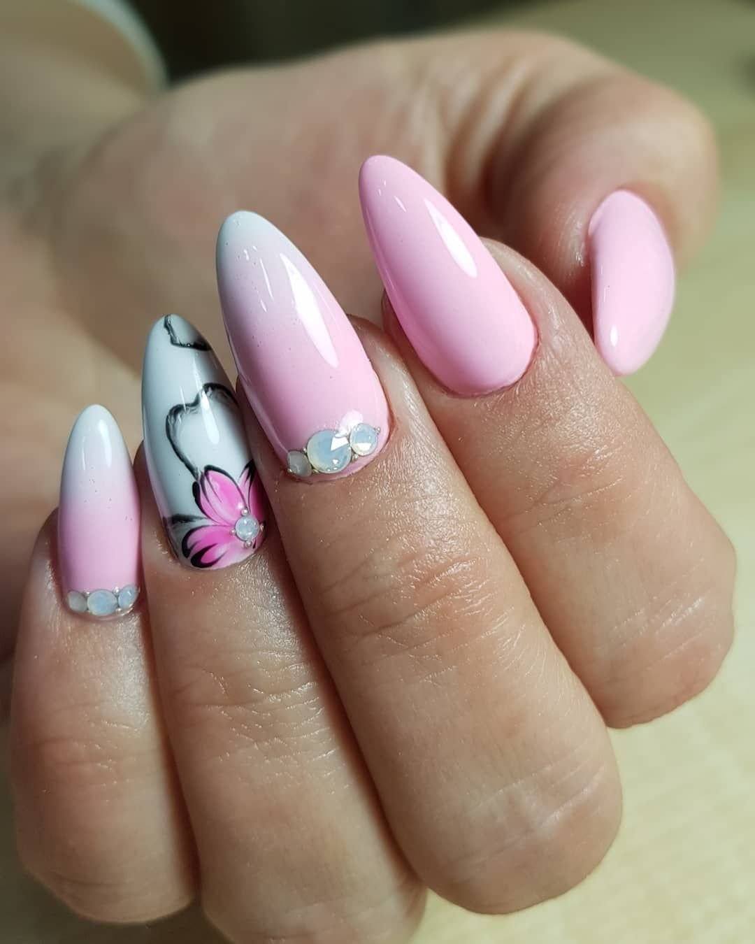 Одно из самых гармоничных и утончённых сочетаний – розовый с белым. С последним цветом можно сочетать как яркие оттенки, так и приглушённые. В дополнении с цветочной росписью каждый из представленных вариантов маникюра смотрится изысканно и романтично.