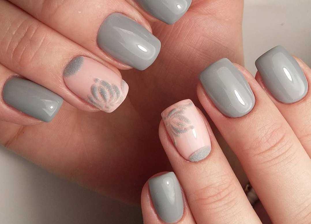 Розовый очень удачно гармонирует с оттенками серого: можно взять этот цвет за основу акцентных ноготков или сделать отдельные штрихи.