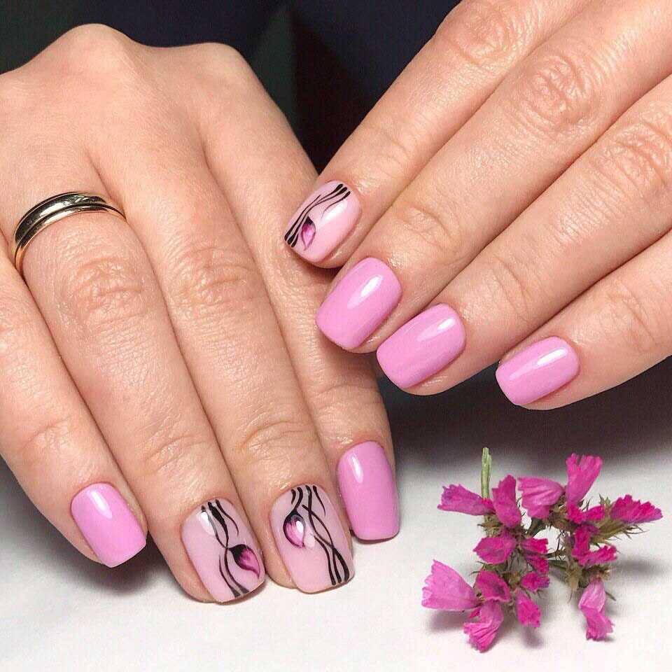 Многие девушки любят сложные дизайны с ручной росписью. Однако, если время на создание нейл-арта ограничено, рассматривают однотонное покрытие с узором на одном пальчике. Геометрия, брызги и мазки краски, стилизованные веточки и потрясающие цветочные росписи, сердечки и надписи, поп-арт и абстракция украсят гель-лак в розовых тонах.