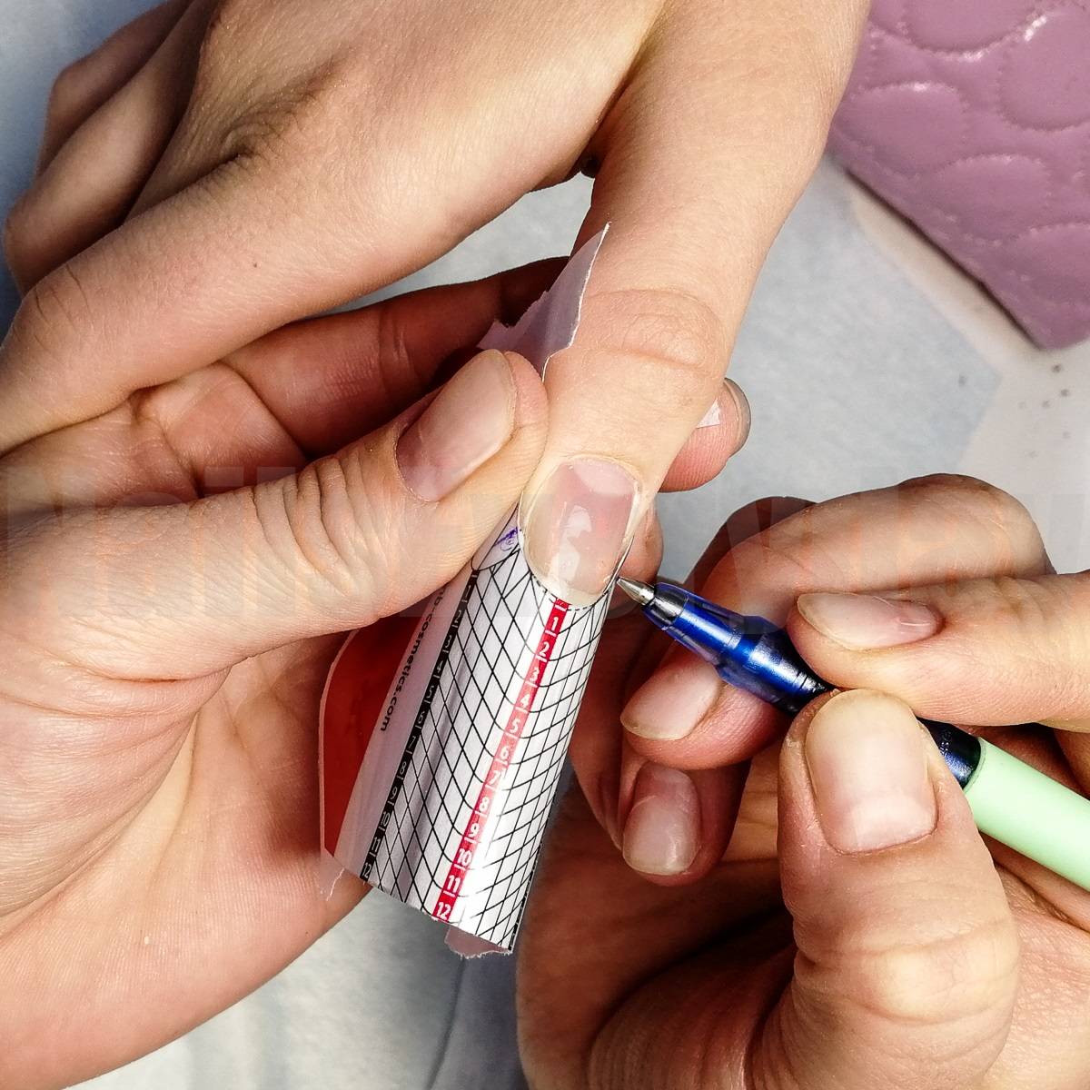 - шаблон примеряется и раскраивается под каждый ноготь отдельно, для того чтобы он встал прямо, а не вниз или вверх;