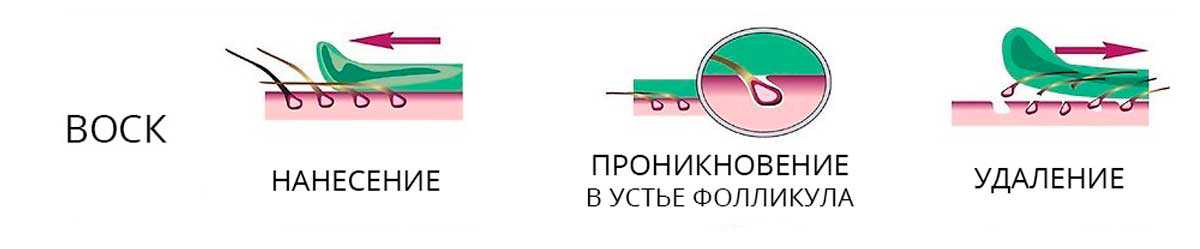 Разогретый воск наносят по направлению роста волос на кожу шпателем или специальным роликом, предварительно очистив, продезинфицировав кожу и присыпав ее тальком, чтобы уменьшить болезненные ощущения, а также для более легкого удаления частичек воска с самой кожи впоследствии. В первом случае воску дают остыть и немного затвердеть, а после этого удаляют его руками, срывая резким движением против роста волос. В этом случае воск наносят на зоны в несколько квадратных сантиметров за раз. Во втором же случае к еще не застывшему воску прикладывают специальные полоски и удаляют волосы, резко срывая полоску. Этот способ позволяет обрабатывать за раз большие зоны и будет идеален для, например, голеней, но не подходит для чувствительных зон, а также имеет гораздо больший риск обломать волосок и оставить “пенек”.