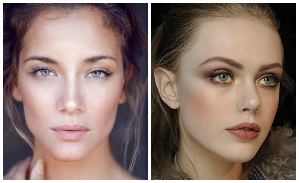 Идеальный нюдовый макияж для зеленых глаз – это отсутствие теней, но многие визажисты предпочитают использовать легкие неброские оттенки, такие как бежевый, телесный, светло-коричневый. Для увеличения разреза глаз на внутреннюю сторону века стоит нанести белый карандаш. Тушь не должна быть черной – стоит подобрать оттенок, максимально приближенный к цвету волос. Чтобы подчеркнуть брови, стоит использовать специальные тени – карандаш использовать не рекомендуется, он не создаст нужного эффекта естественности.