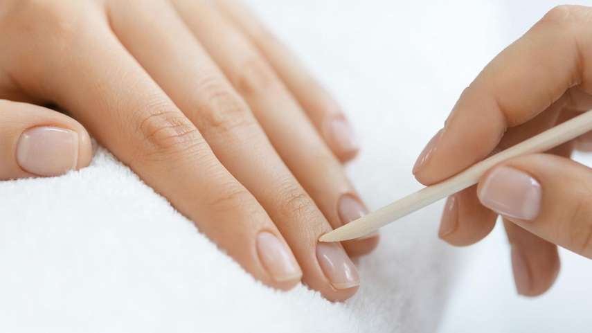 - Обработка кутикулы. Руки обтираются сухими полотенцами, а затем кутикула аккуратно отодвигается апельсиновой палочкой. Из-за жирности пластины инструмент может скользить, поэтому работать им нужно медленно, чтобы избежать повреждения кожи.