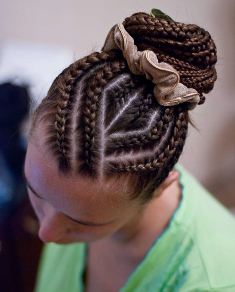 Другой вариант прически – «Корзиночка», которая состоит из простых африканских кос. Закрепить ее помогут заколки-крабы. Кончики следует спрятать внутрь. Прическу можно выполнить самостоятельно.