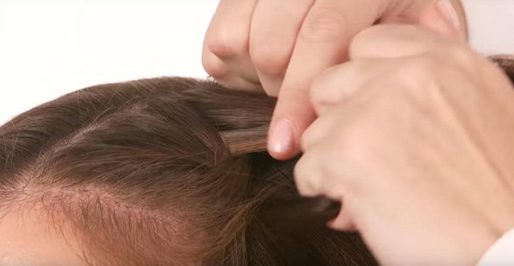 Необходимо хорошо расчесать волосы. Затем следует отделить небольшую прядь у лба. После этого отделяется основная прядь и две рабочие.