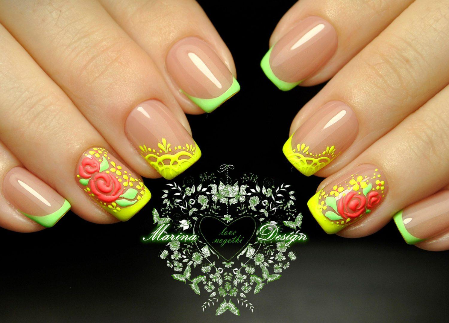 Для романтичных и изящных женских натур идеально подойдет французский маникюр, имеющий в себе цветочный принт. Именно этот вариант имеет линию улыбки, нанесенной в виде мелких цветочков и лепестков. Данная версия маникюра отлично будет гармонировать с летним и воздушным сарафаном. К тому же такой дизайн ногтей можно использовать даже в холодное время года. Особенно если стиль одежды имеет также цветочный рисунок. Тем более, что для выполнения бутонов можно использовать различные цветовые оттенки лакового покрытия или даже одновременно сочетать сразу несколько цветов.